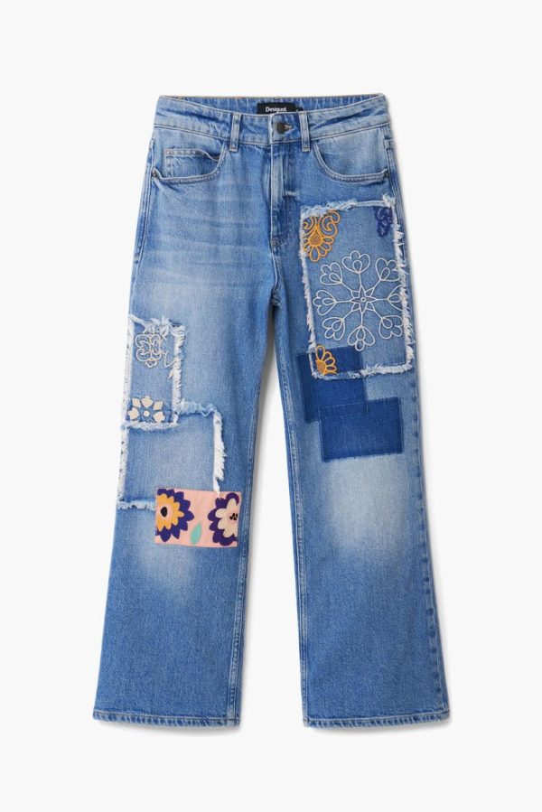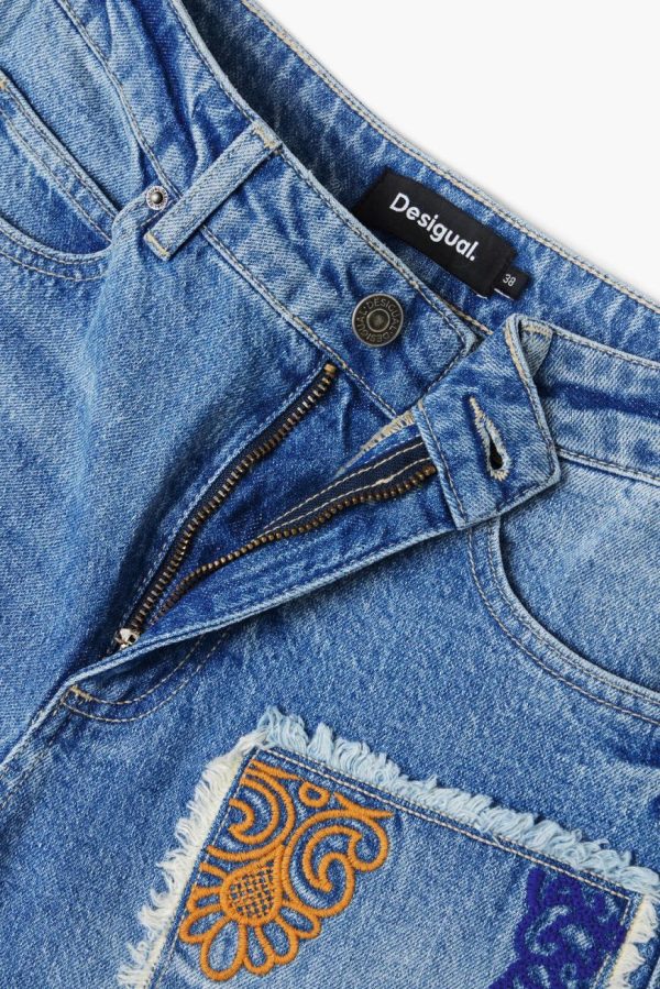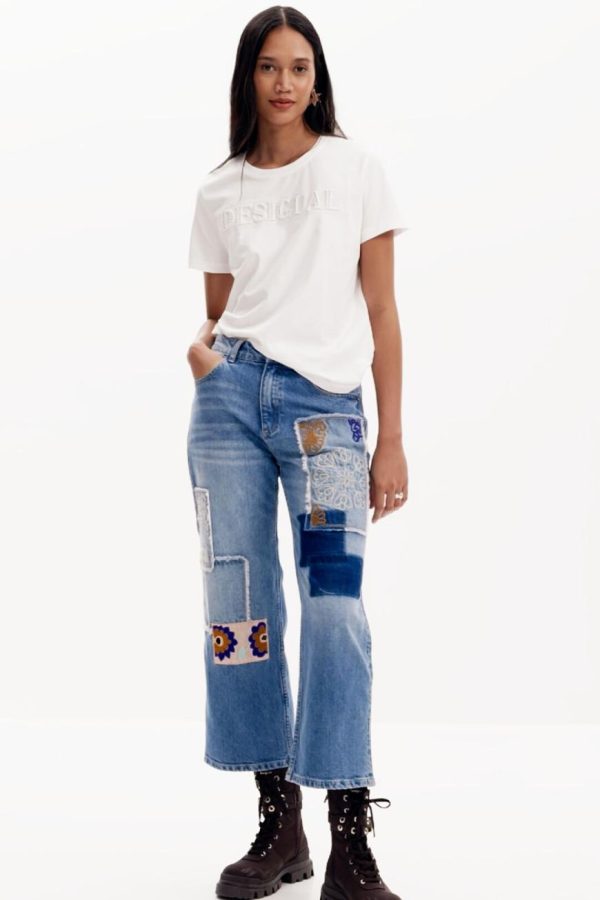 High-waisted culotte jeans with fabric patches and button and zipper closure