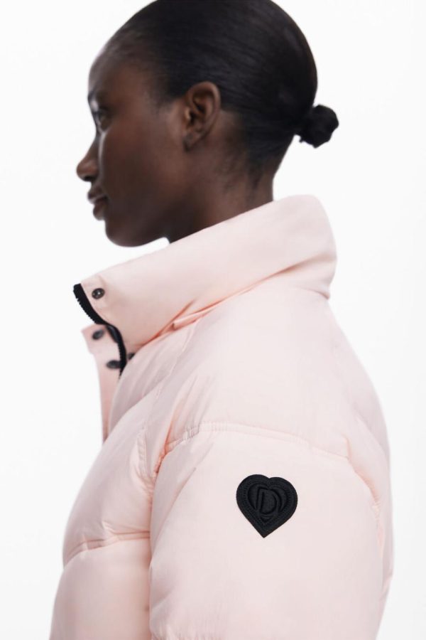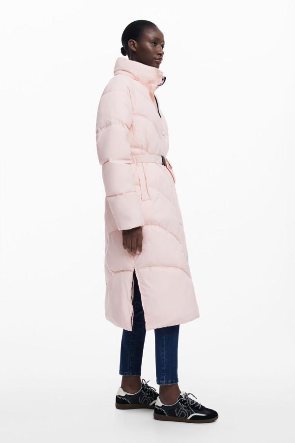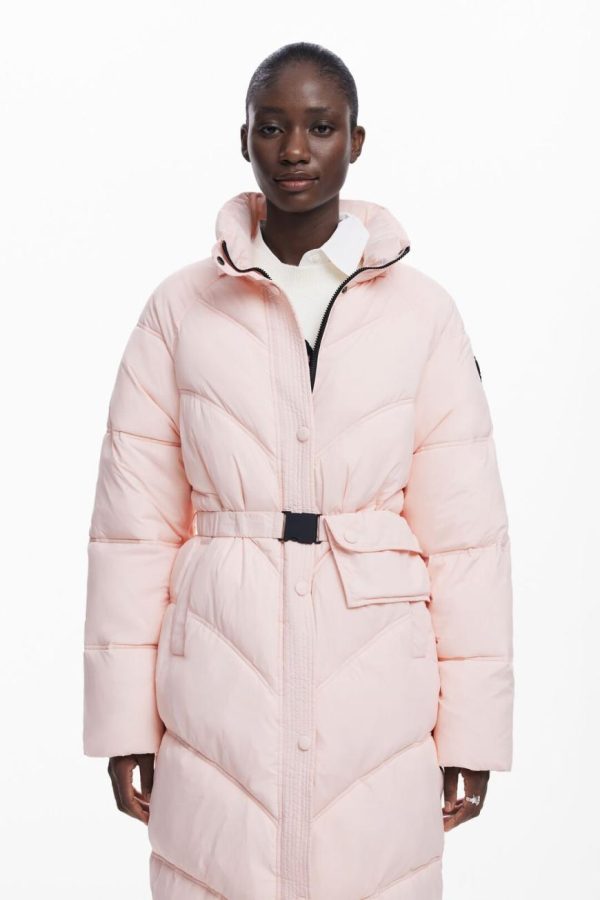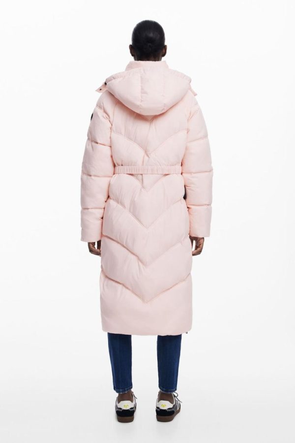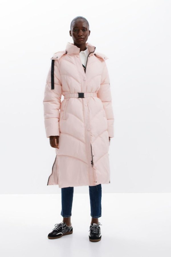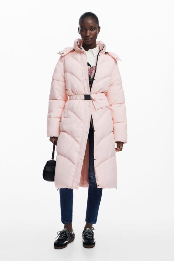 Long padded coat with removable hood and belt with detachable pocket in baby pink.