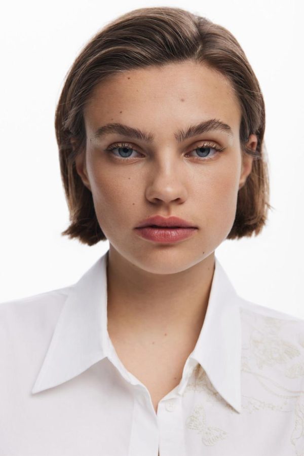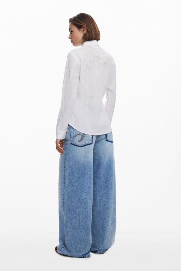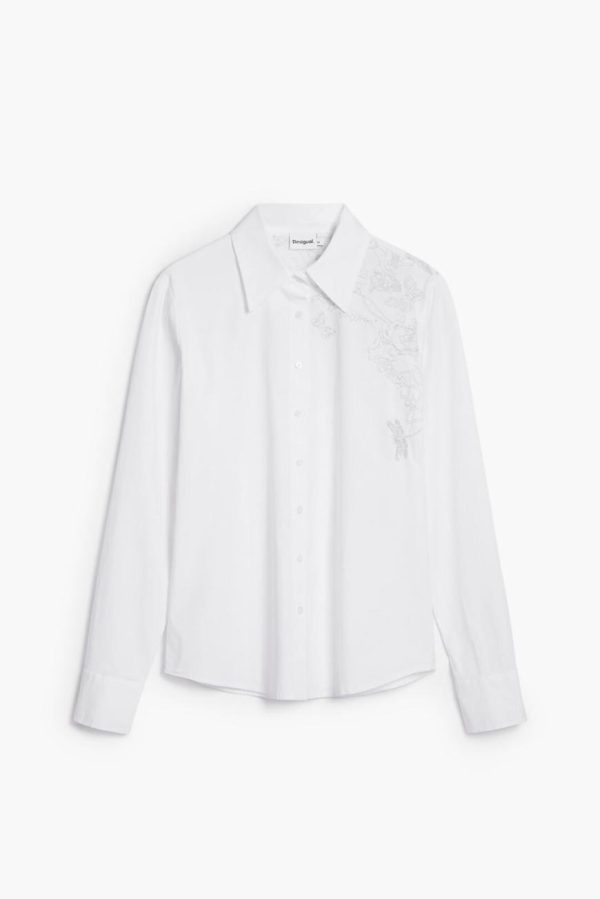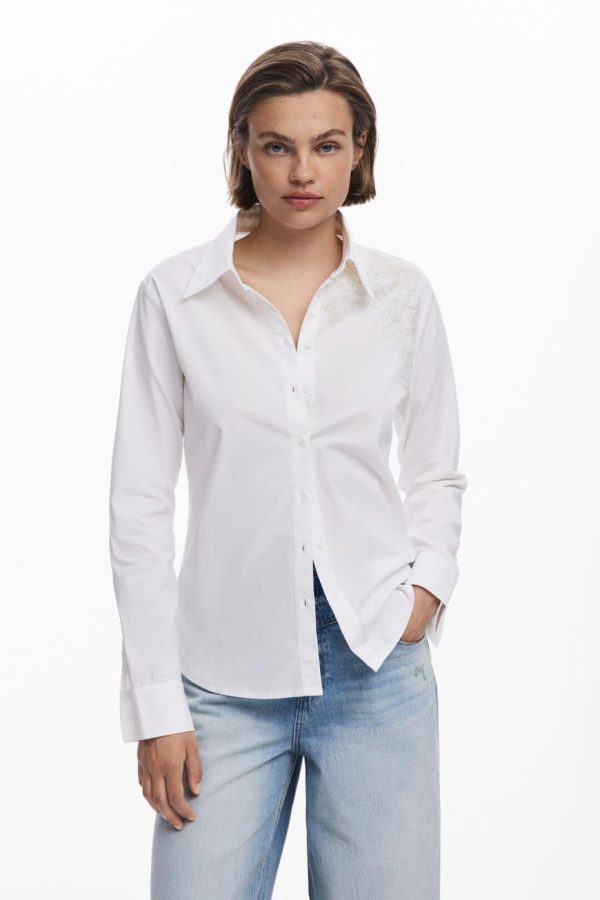 Long-sleeve shirt in a solid color with tone-on-tone embroidery featuring natural motifs and logo.