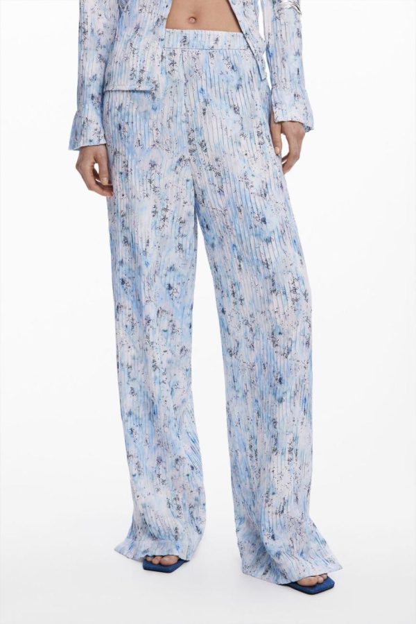 Straight-cut long pants with pleated fabric, side pockets, and zipper and button closure.