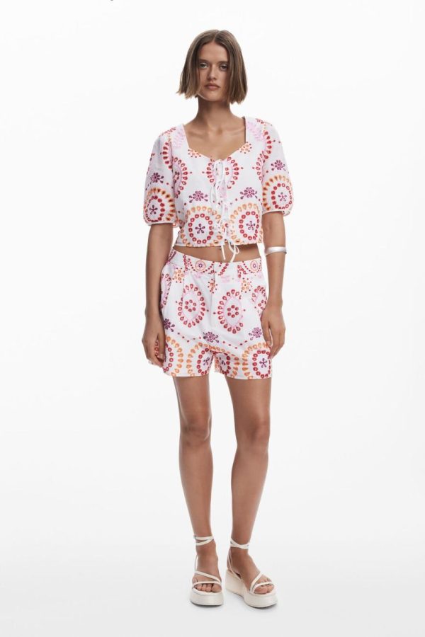 Regular fit shorts with side and back pockets, elastic waistband, zipper and button closure, and ornamental print.