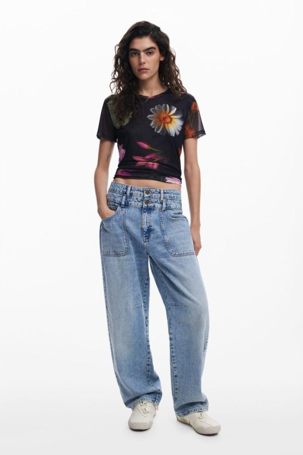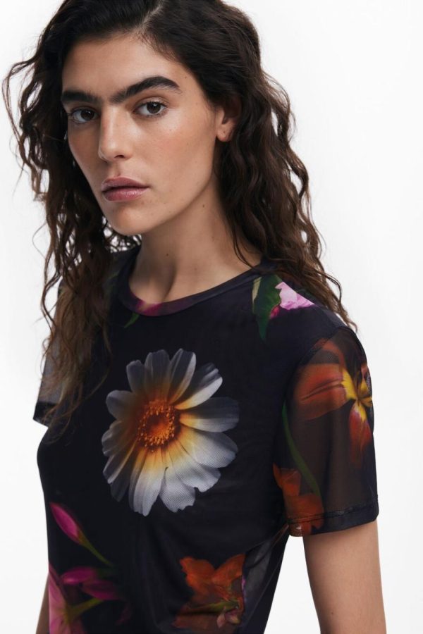 Short-sleeved tulle T-shirt with inner lining, round neck, and floral print.