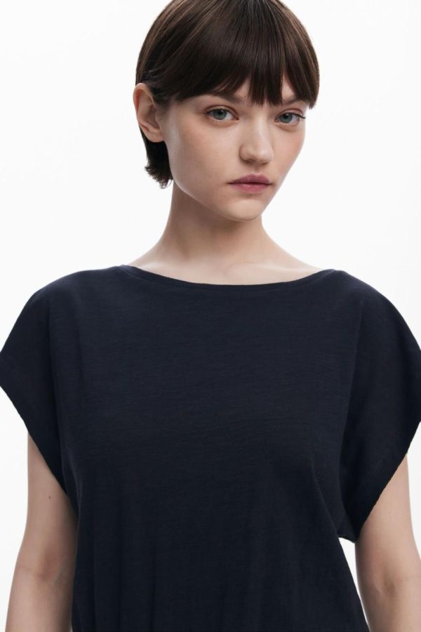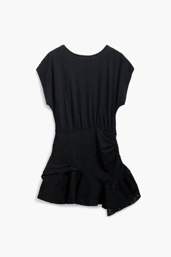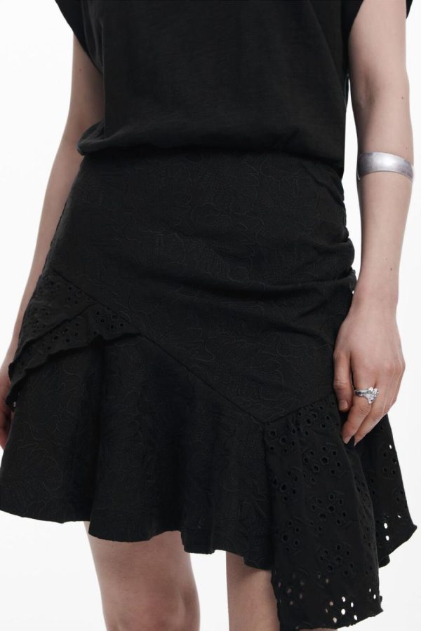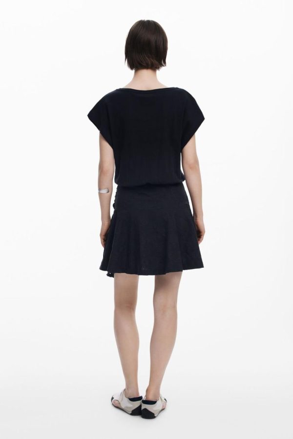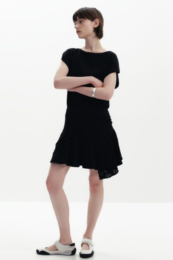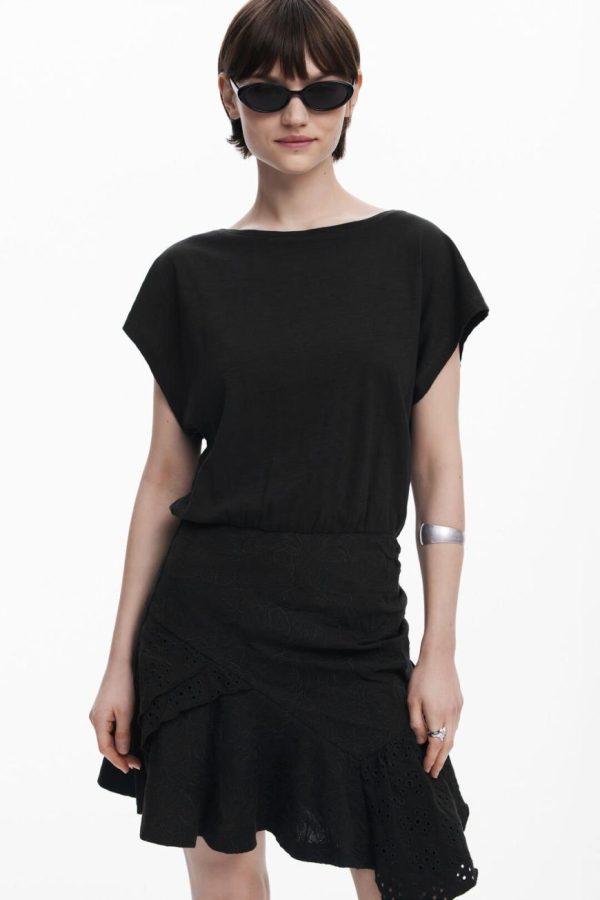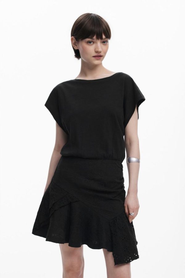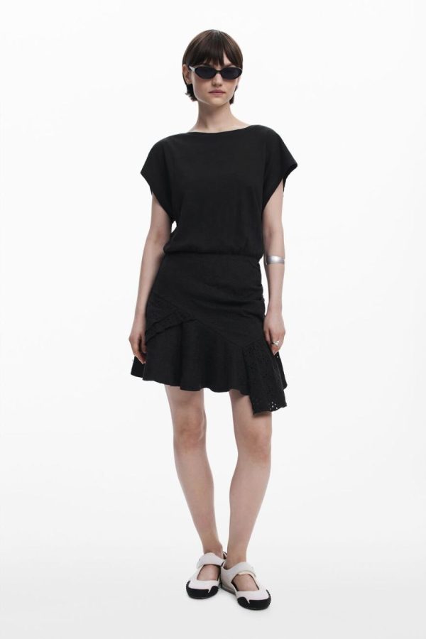 Short dress with two-piece effect featuring a puffed top and an asymmetrical skirt with embroidery.