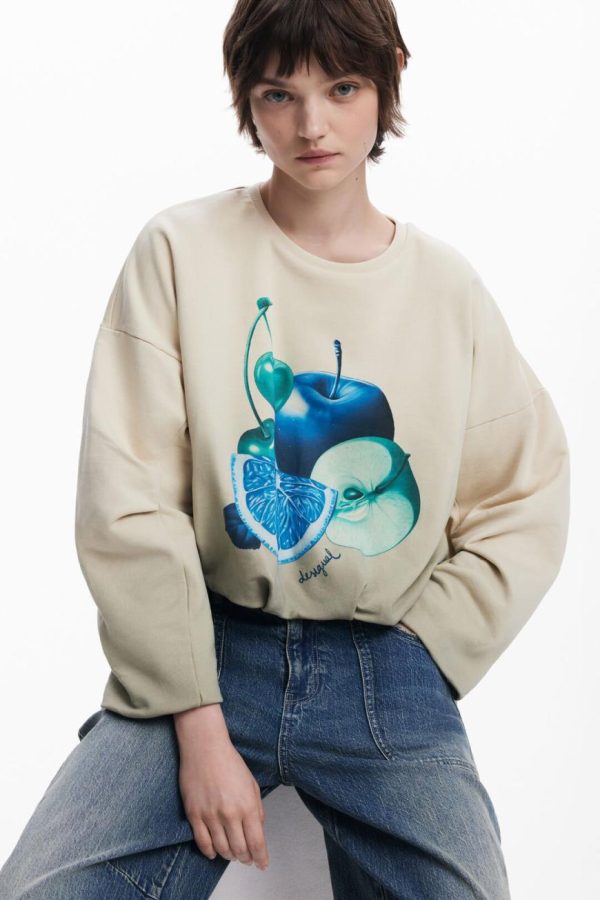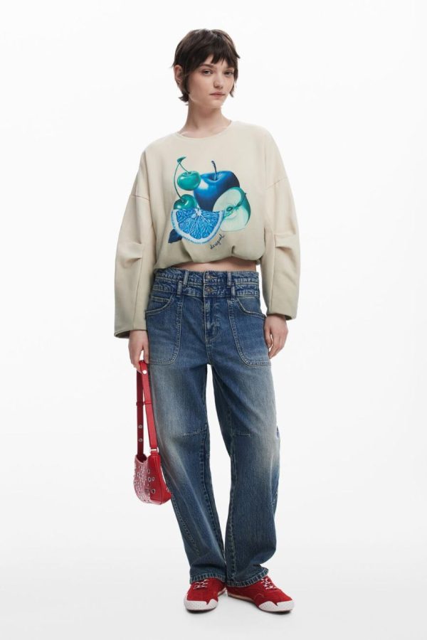 Round neck sweatshirt with long voluminous sleeves, with a puffed hem and still life print.