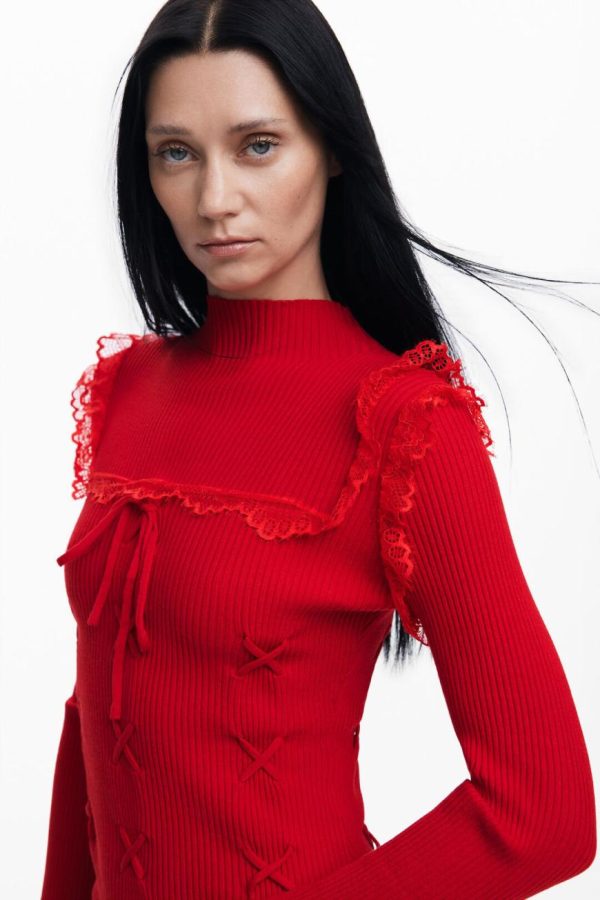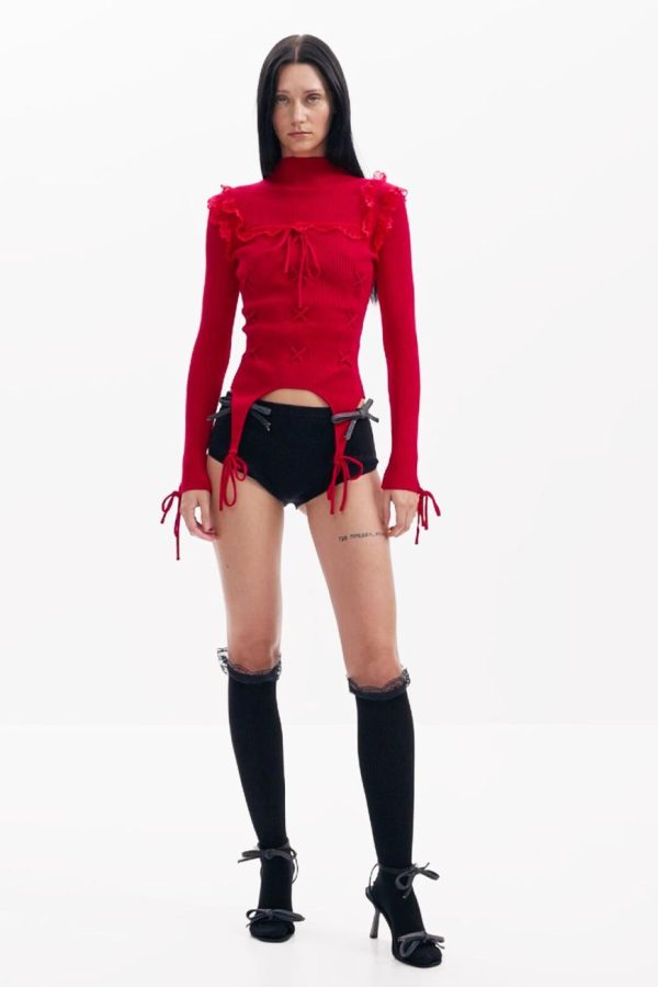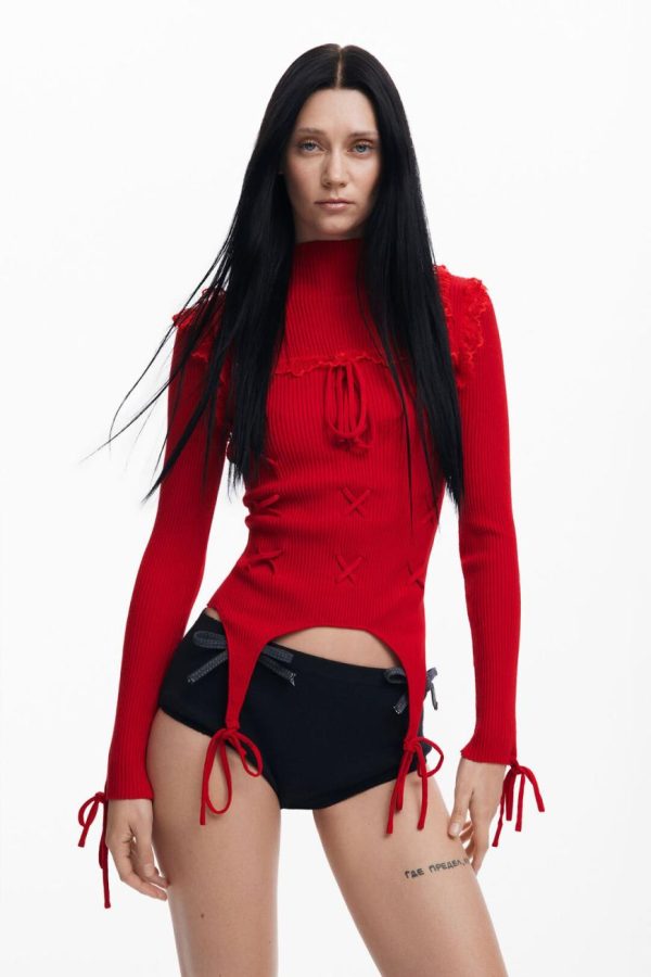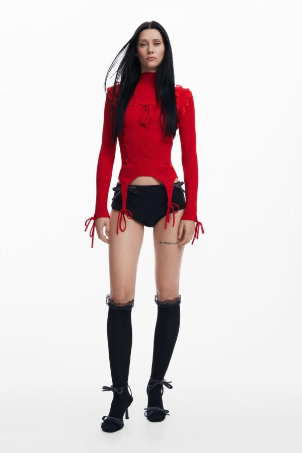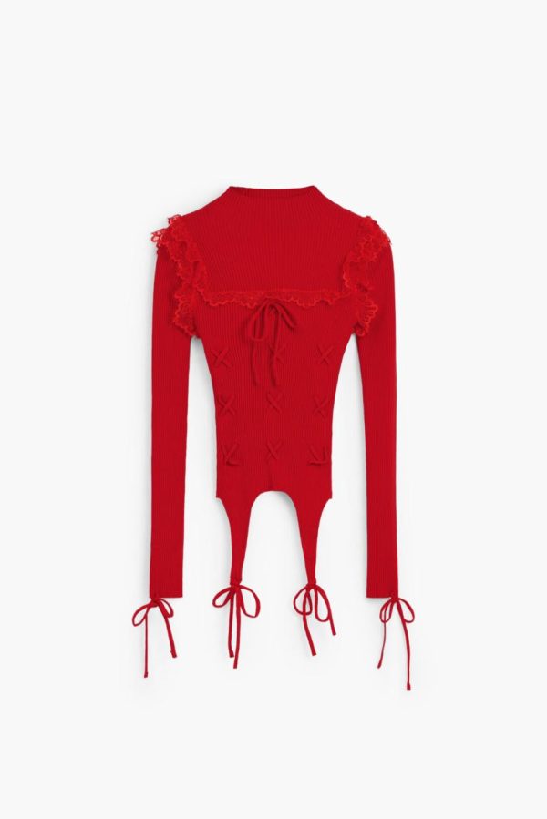 Two-piece monochromatic knit sweater that gives the sensation of a long-sleeve sweater and a layered tank top, with embroidered bow details on the sleeves and bottom, designed by María Escoté.