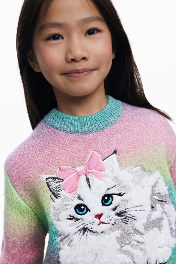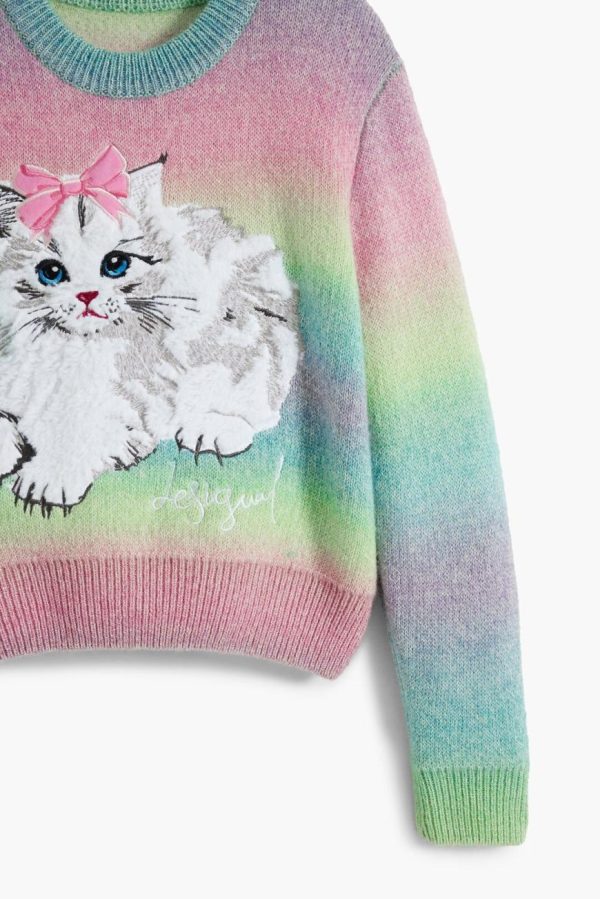 Medium gauge sweater with long sleeves and round neck, plain background and colorful print with embroidered cat.