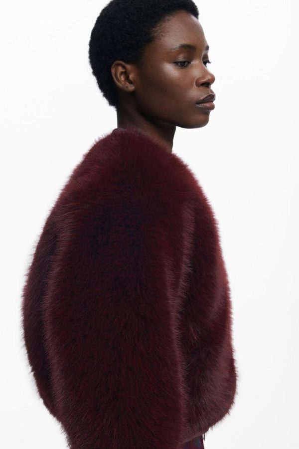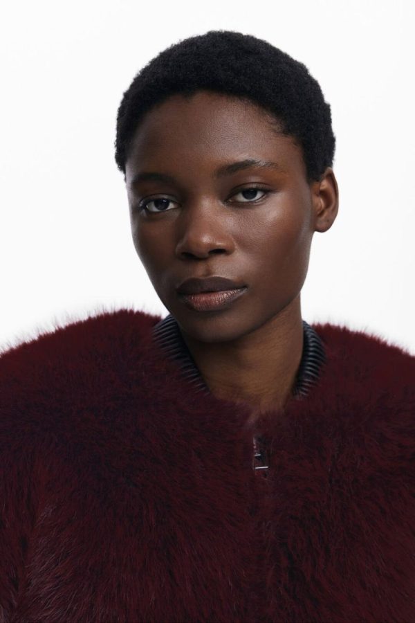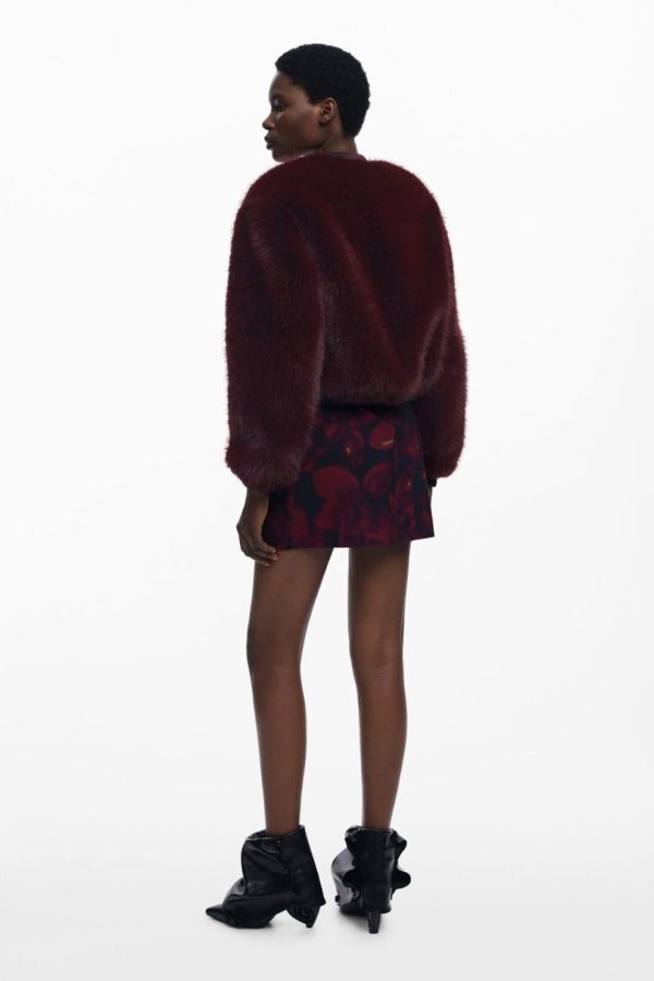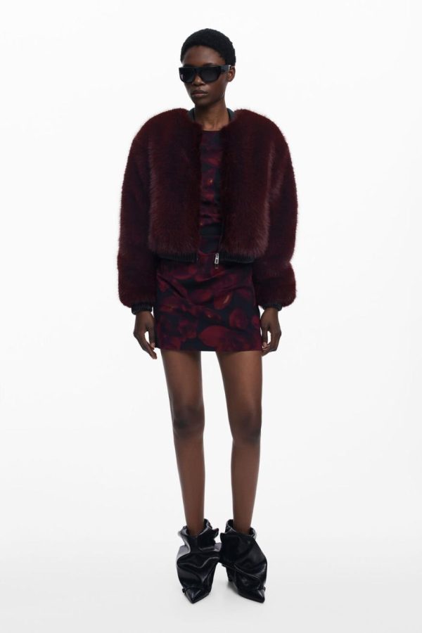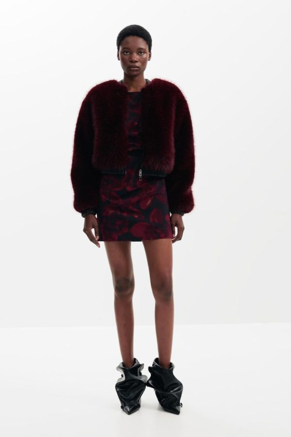Short faux fur bomber jacket, knit collar, and zipper closure in raspberry color.