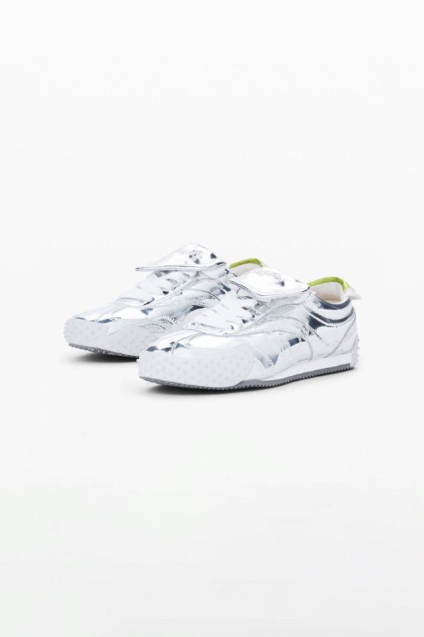 Low-top sneakers with vintage aesthetic, contrasting embroidered details, and maxi tongue