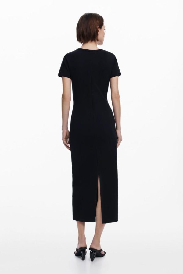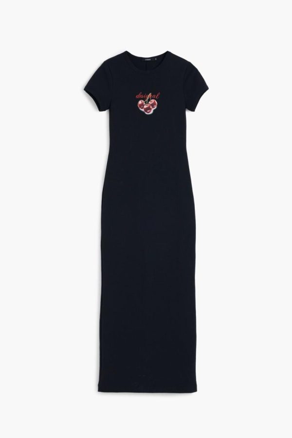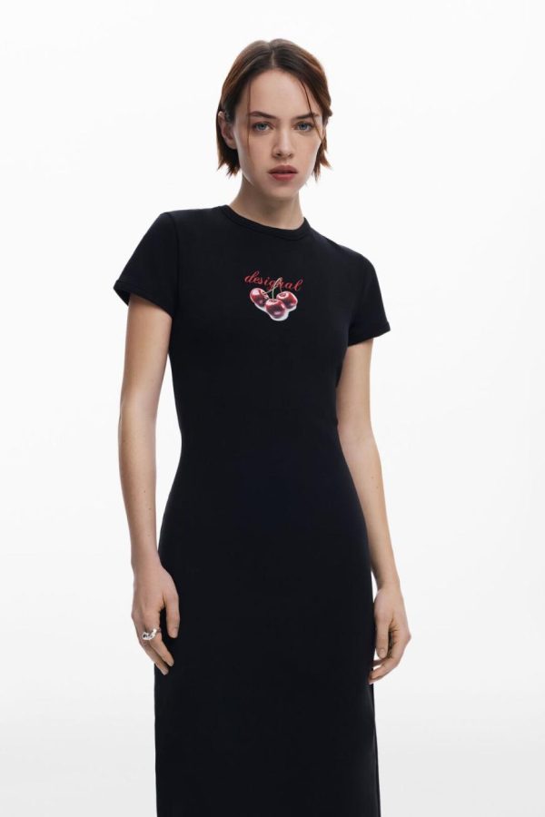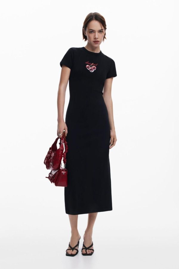 Elevate your wardrobe with this chic ribbed midi dress featuring a timeless round neckline, flattering short sleeves, and an elegant back slit. The solid black background is beautifully accented with a playful cherry print that adds a touch of whimsical charm to your look.