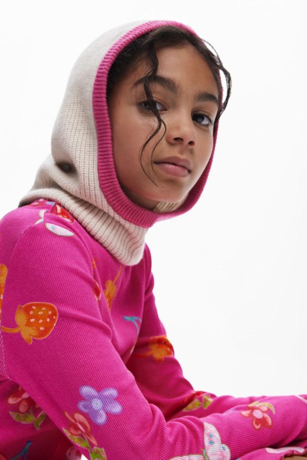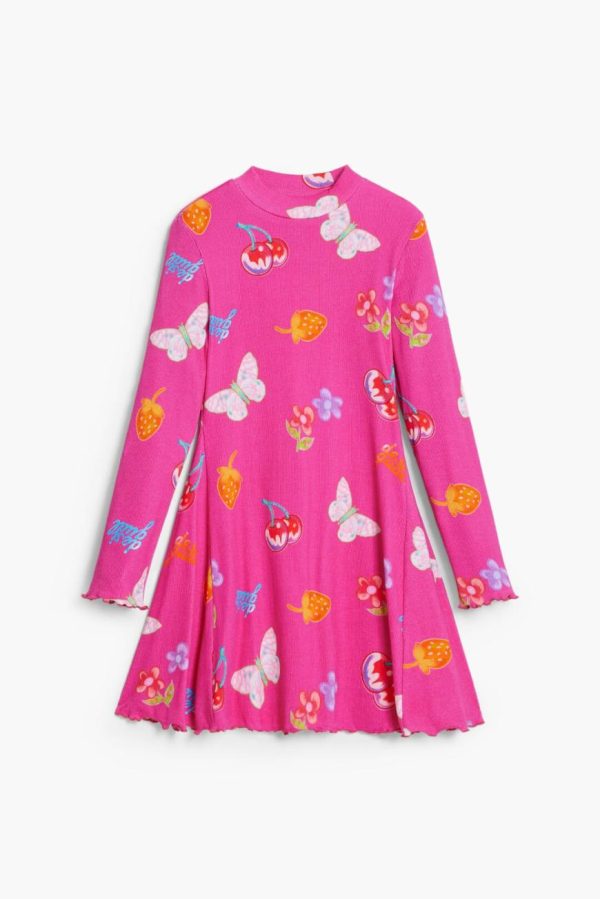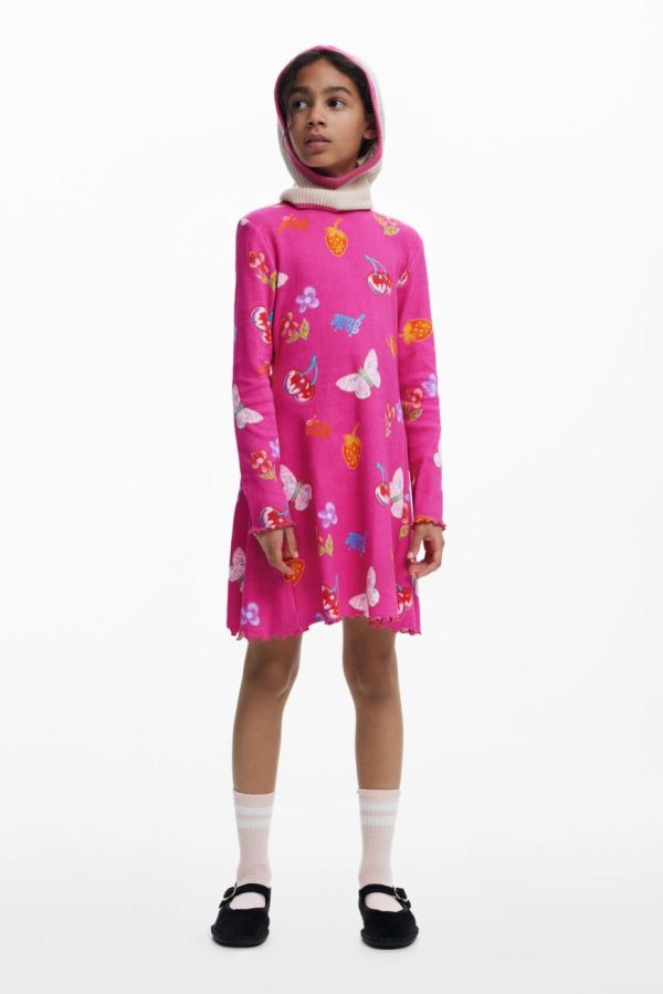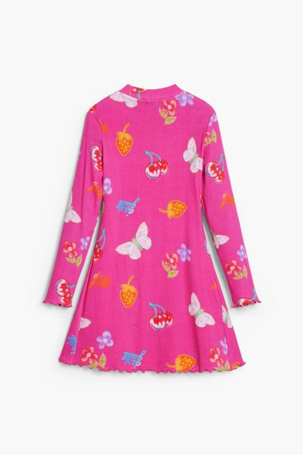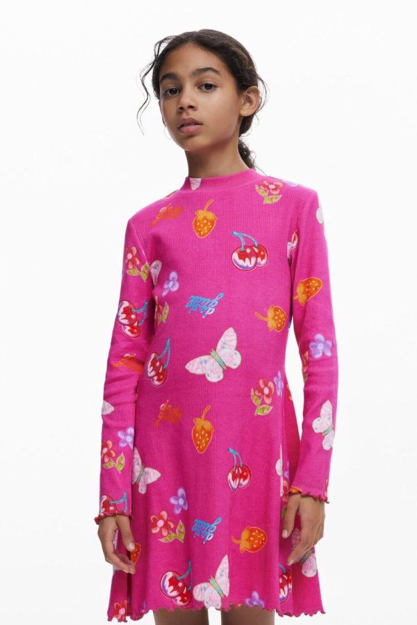 Long-sleeve dress with a round neck, skater style, in ribbed knit, sleeves with ribbed finish and print of fruits, flowers, and butterflies.