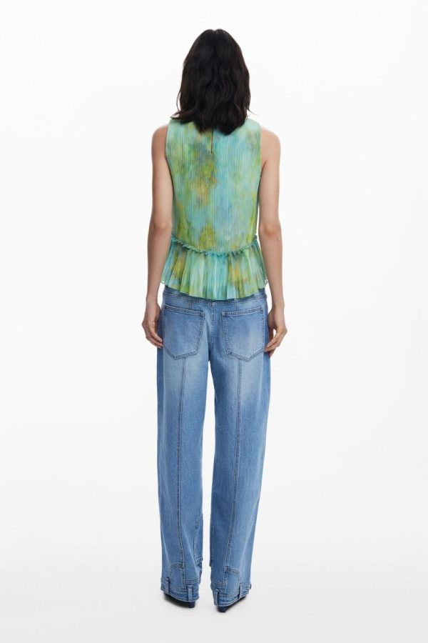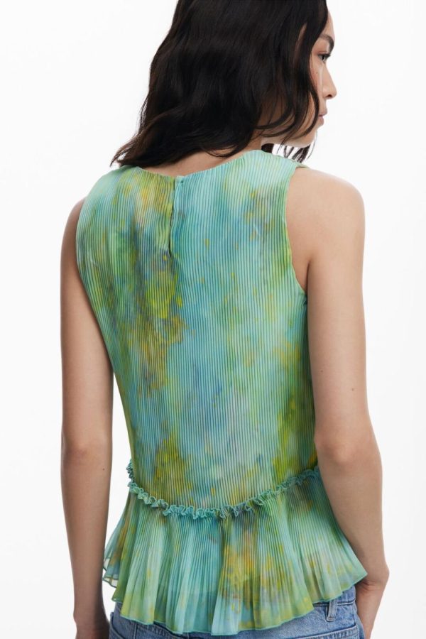 Sleeveless blouse with pleated fabric, elastic waistband ruffle, and blurred floral print.