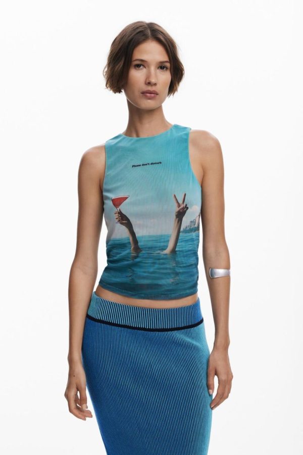 Sleeveless racerback tank top in solid color with a message and sea photograph print.