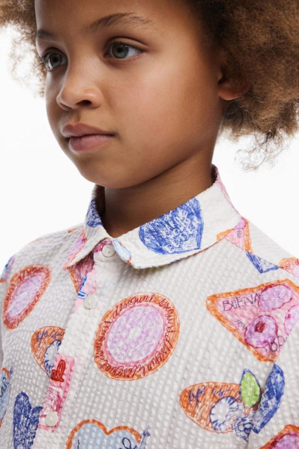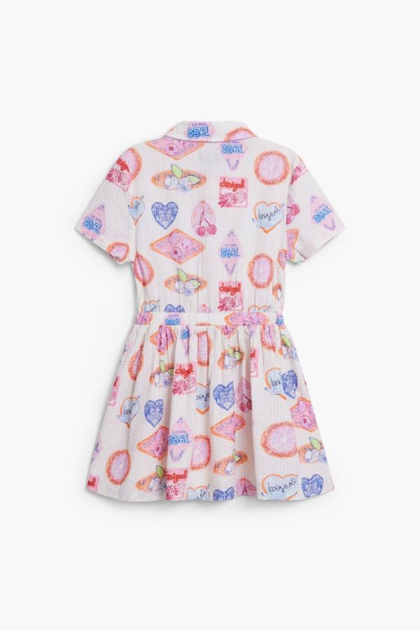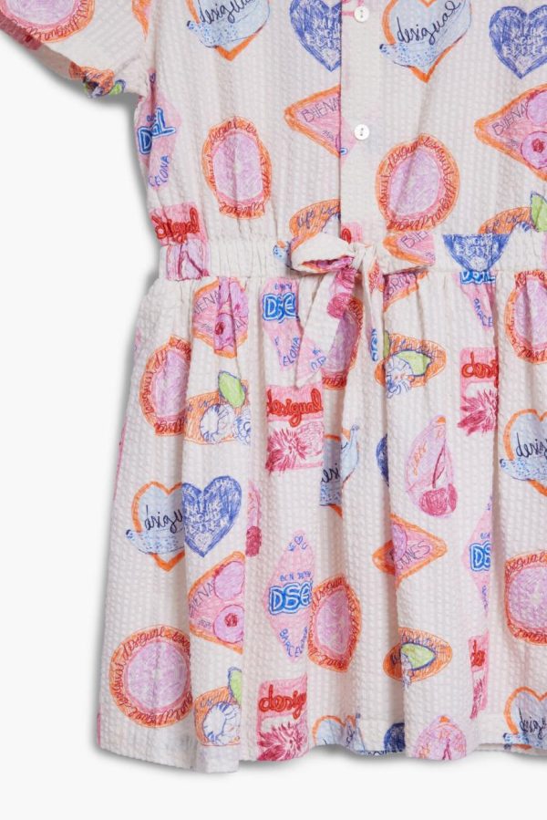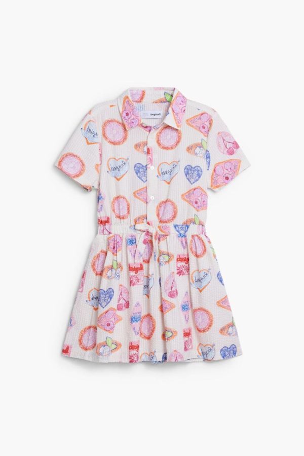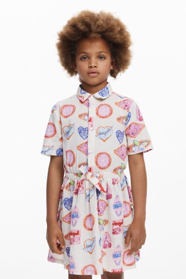 Textured short-sleeve shirt dress with a flared skirt, waist tie detail, and colorful stamp print.
