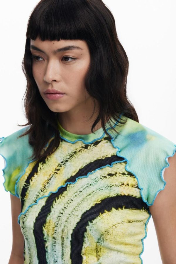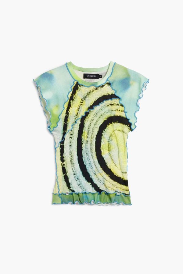Short-sleeve T-shirt with a round neckline, circle design with fraying, and hem detail.