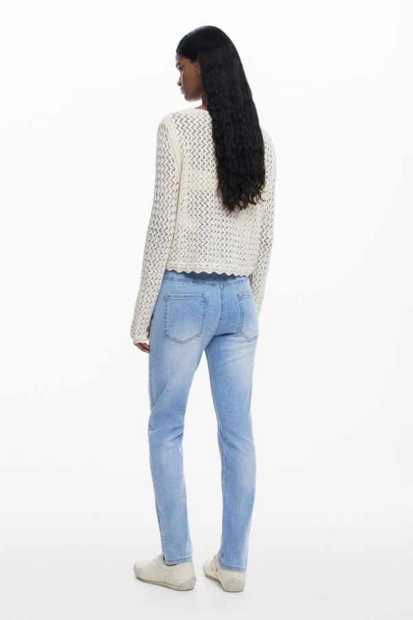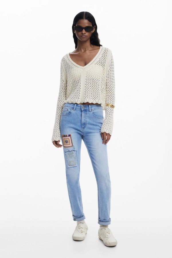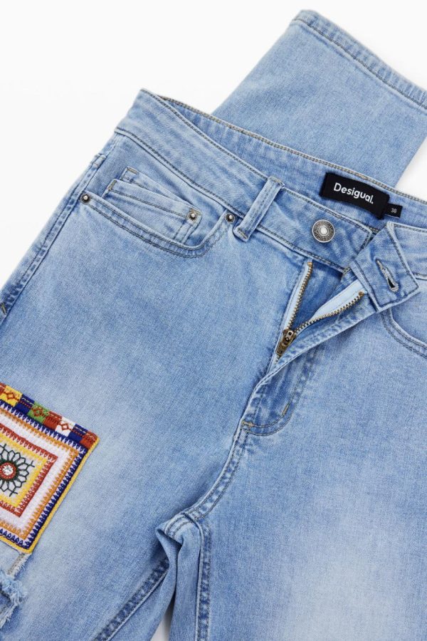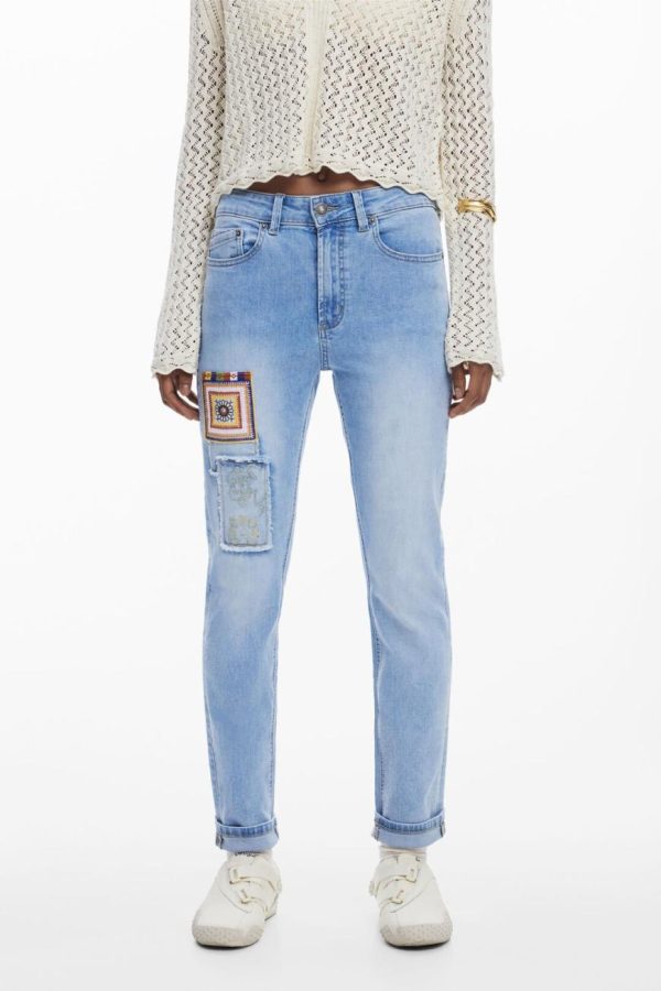Skinny fit jeans with a worn effect featuring crochet patch details and embroidery.