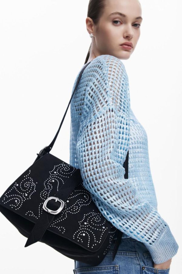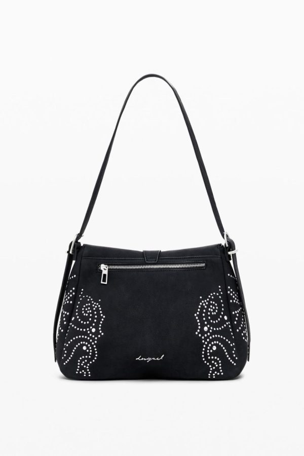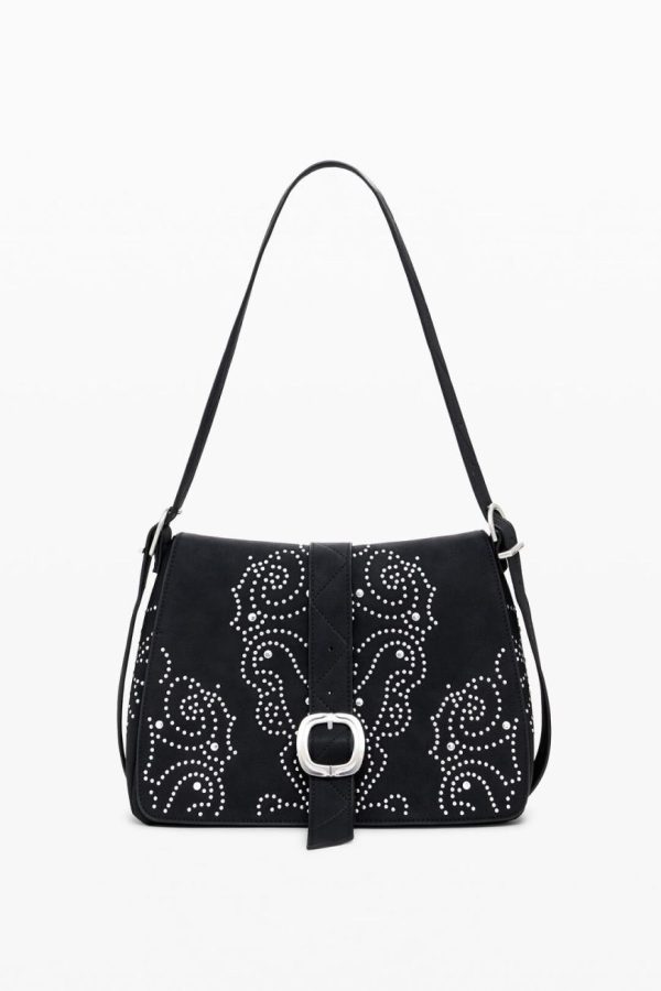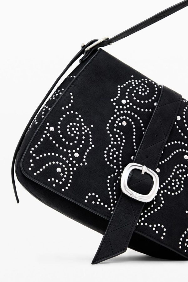 Crossbody style bag in faux leather fabric, solid color, with metal stud details, adjustable strap, and zipper closure.
