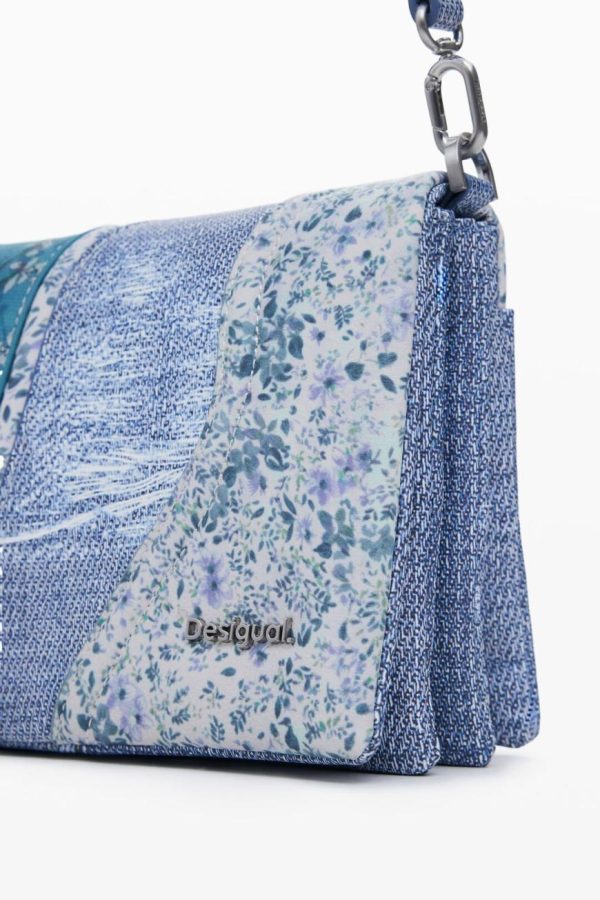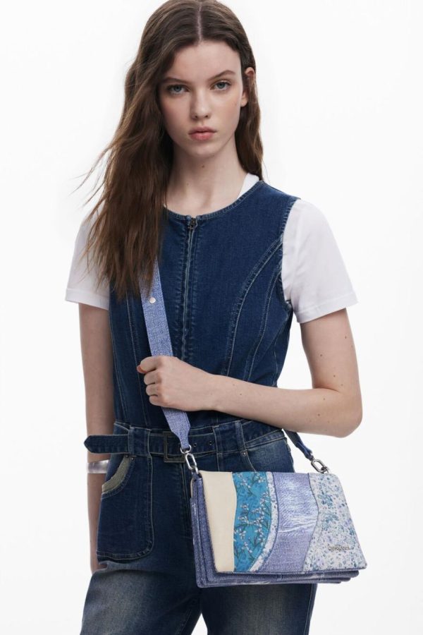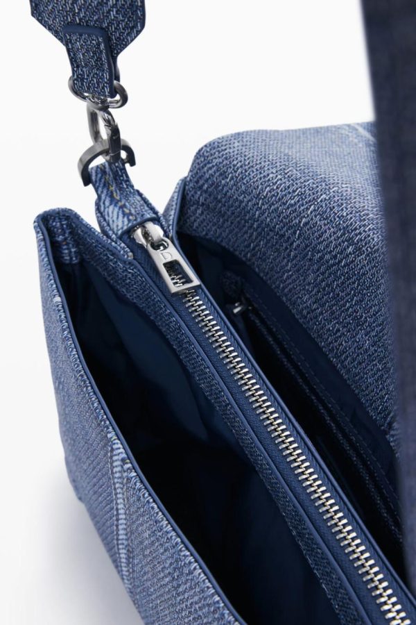 Shopper-style bag, faux leather with denim effect print, with double handle and zipper closure.