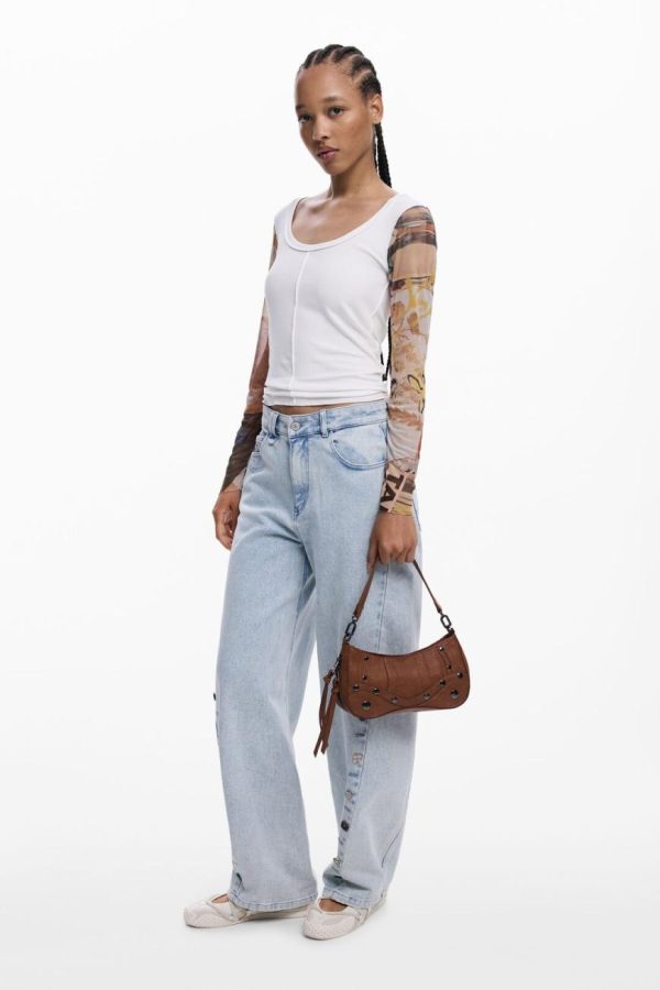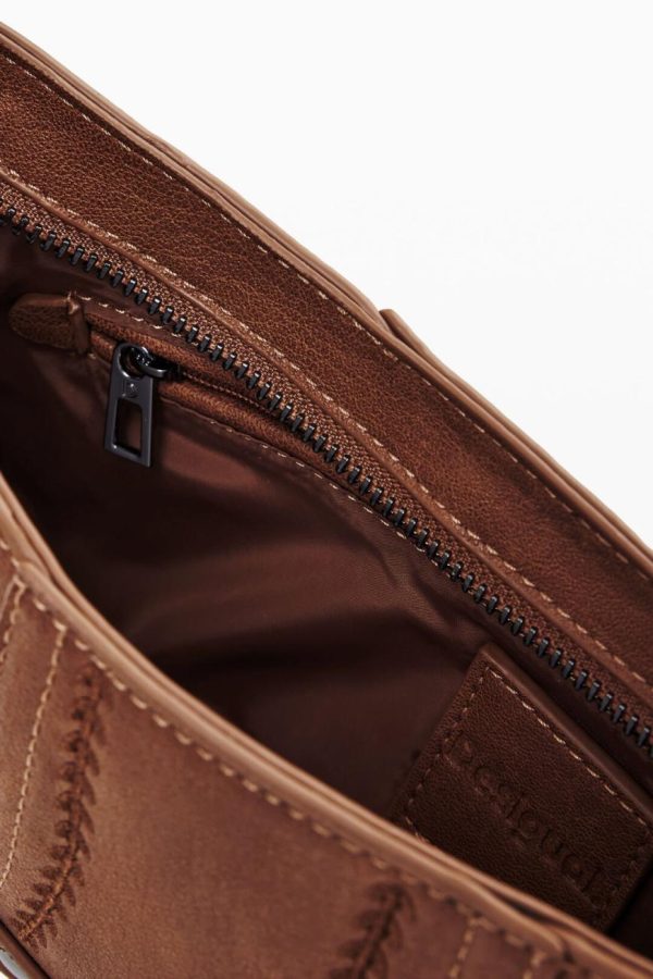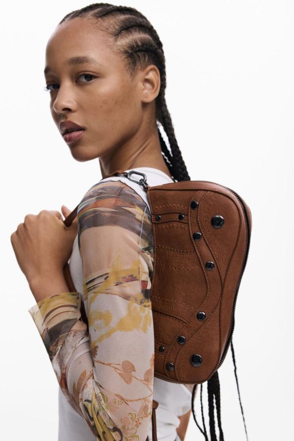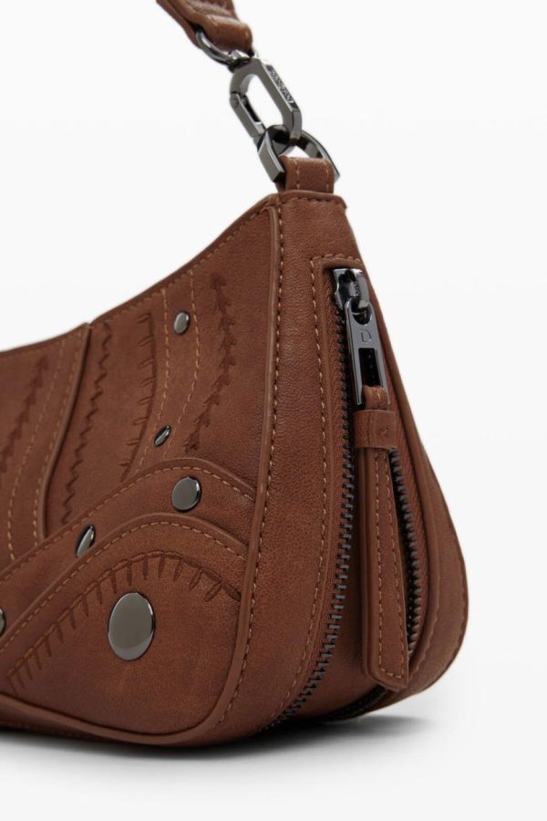 Small crossbody bag in solid color leather effect with patch effect, 3D embroidery, and metal stud detail.