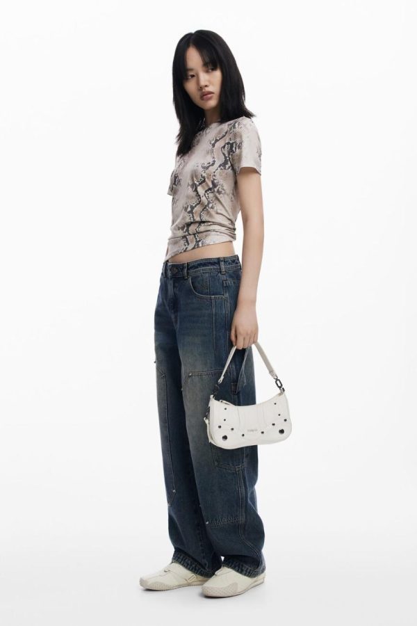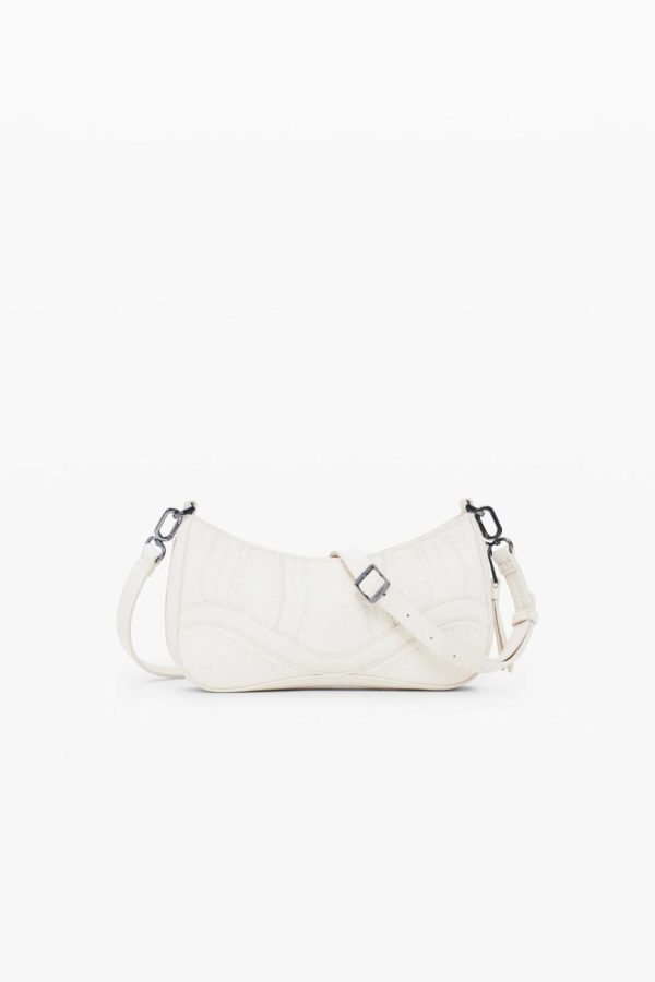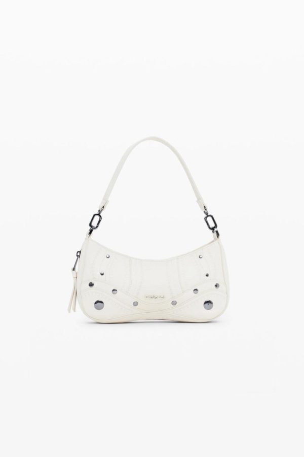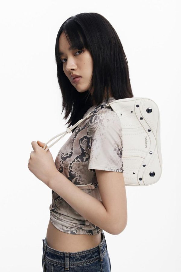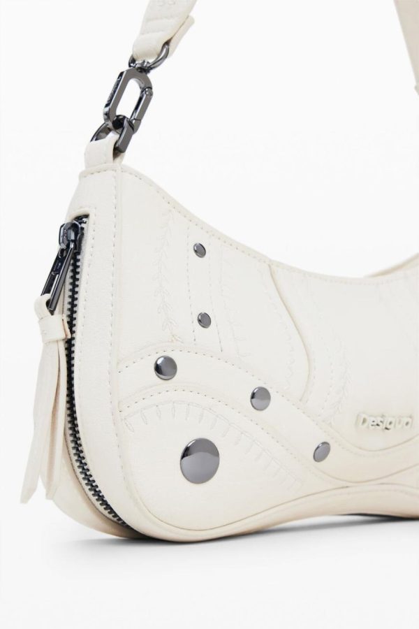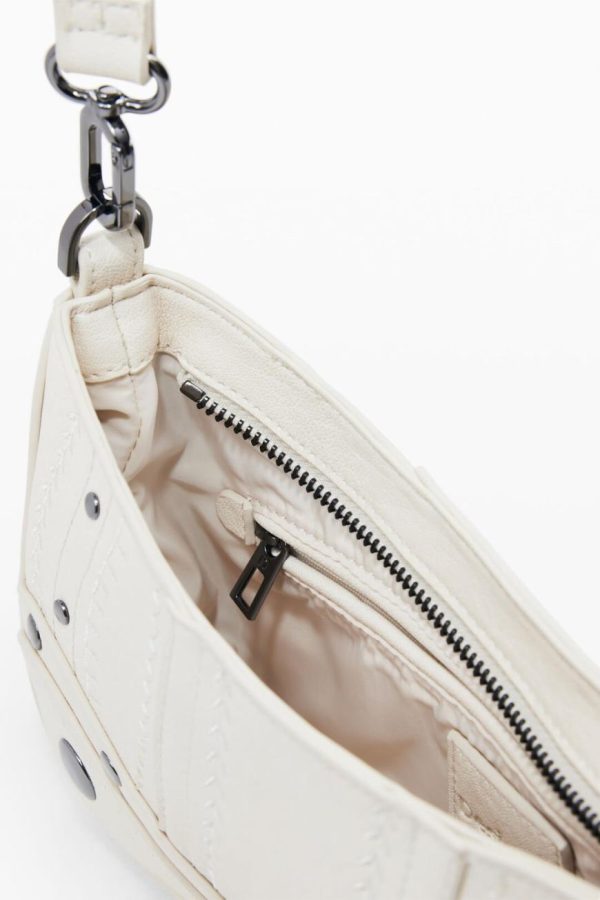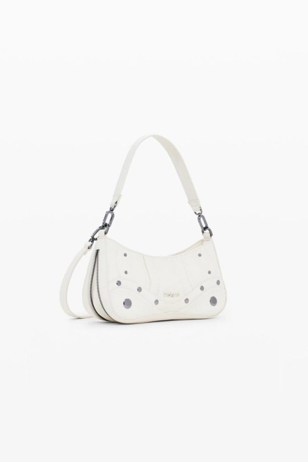 Small faux leather effect bag, zipper closure, and embroidery and metallic appliqué details.