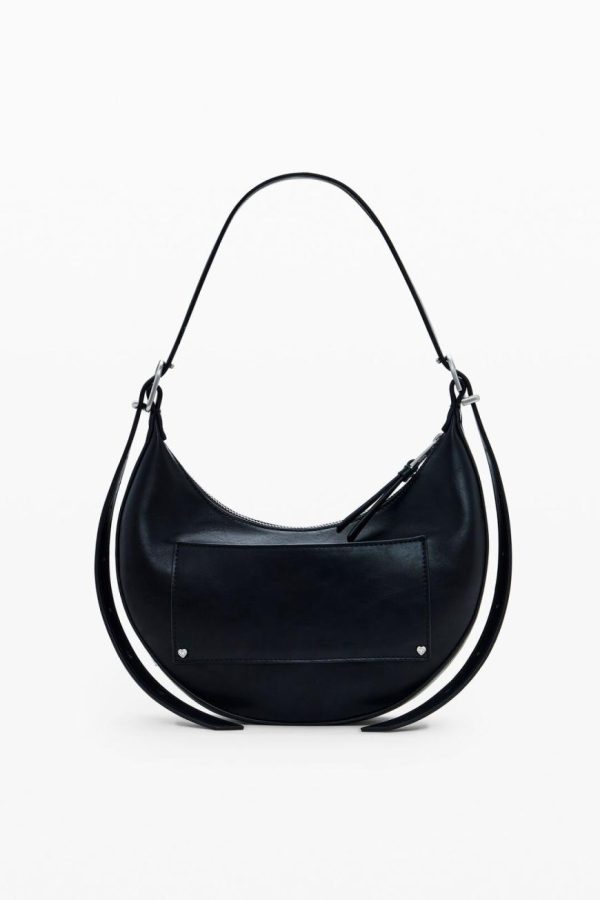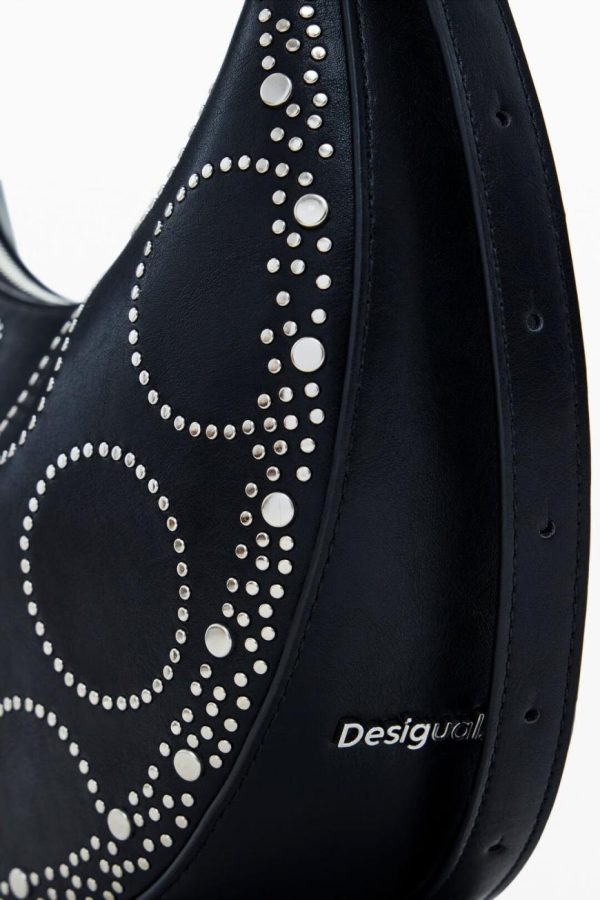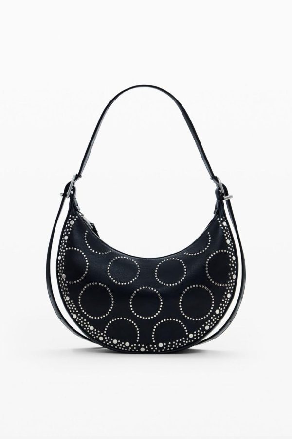 Chic half-moon shaped shoulder bag featuring premium leather-look material with eye-catching stud accents for a bold fashion statement.