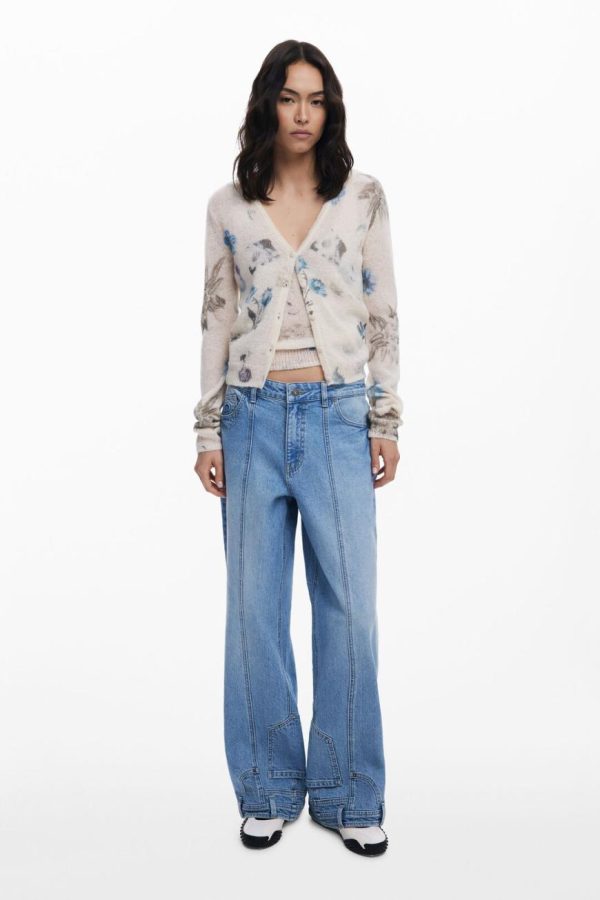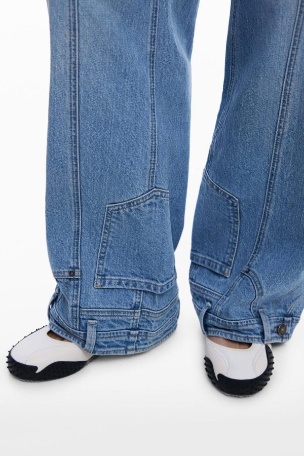 Light long denim pants with a worn effect and inverted effect details at the hems.