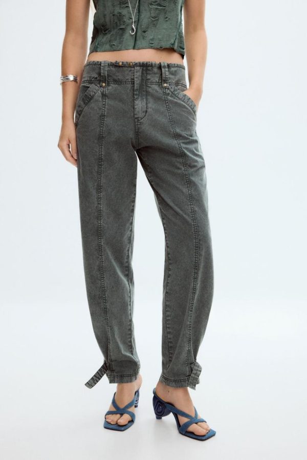 Washed-effect trousers, straight with decorative seam details on the front, adjustable hem and elastic waistband.