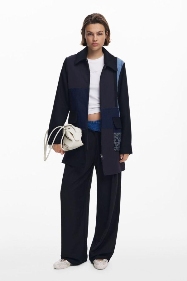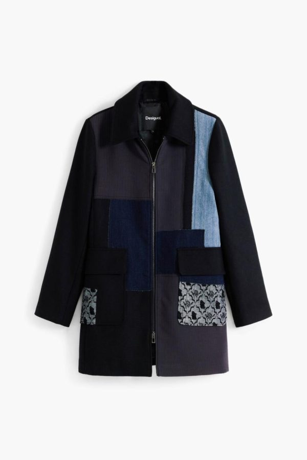 Short straight-cut coat with front pockets, zipper closure, shirt collar in patchwork of different prints and fabrics.