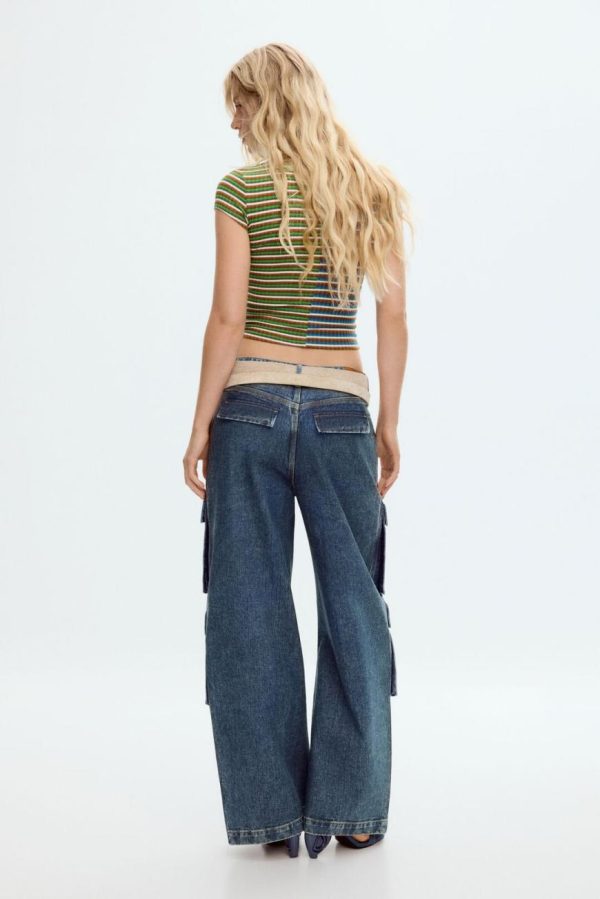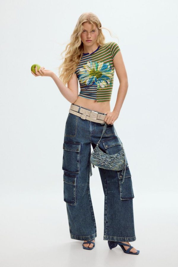 Short-sleeved T-shirt with colorful stripe design and large deconstructed flower on the front.