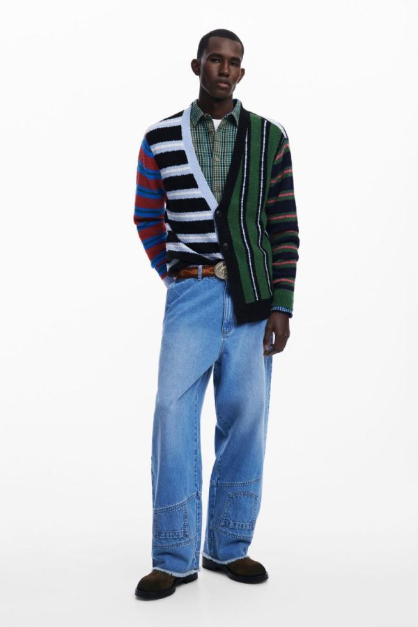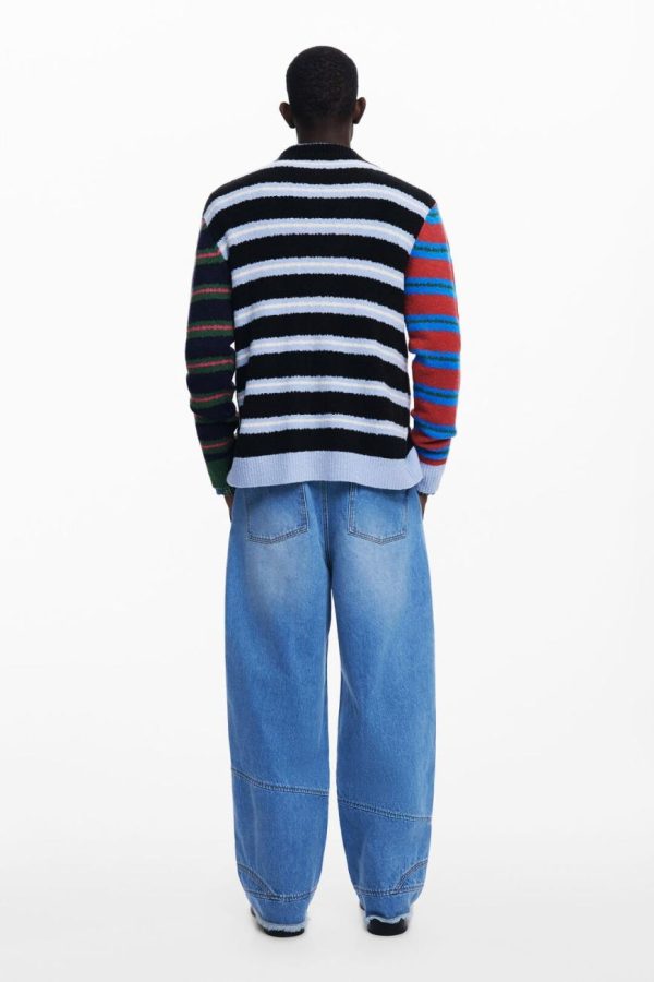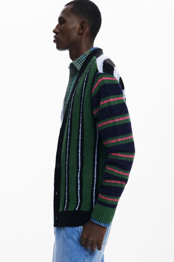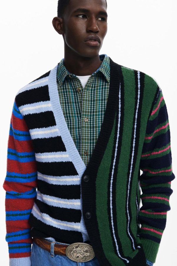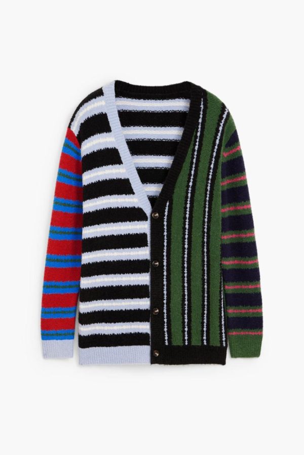 Long-sleeve knit cardigan, V-neck and button closure with a striped print in different colors.