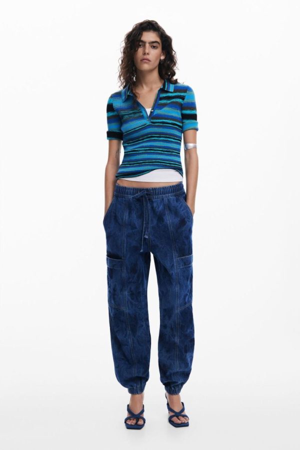 Three-quarter sleeve T-shirt, polo-style collar with button closure and striped print