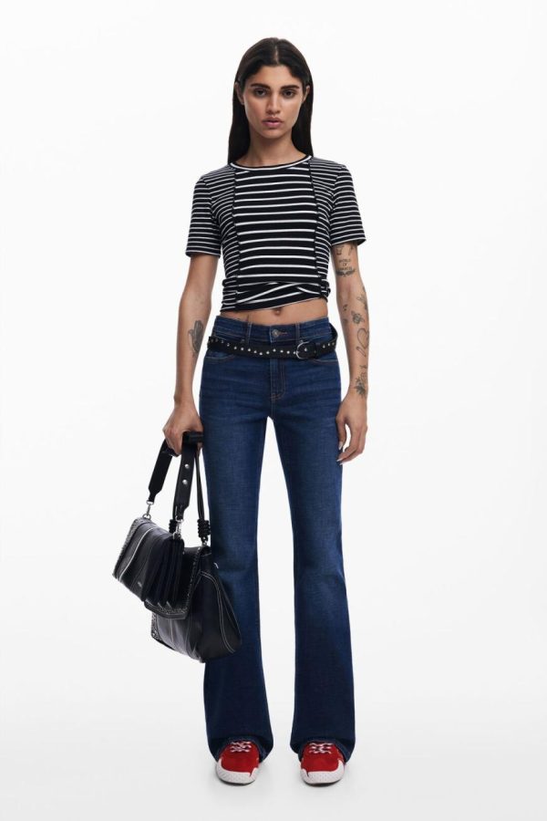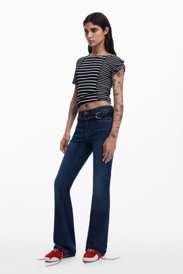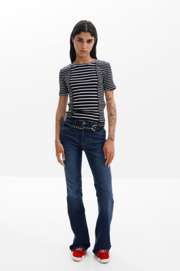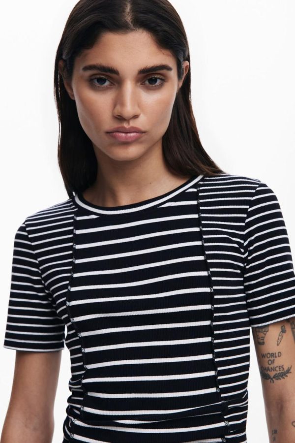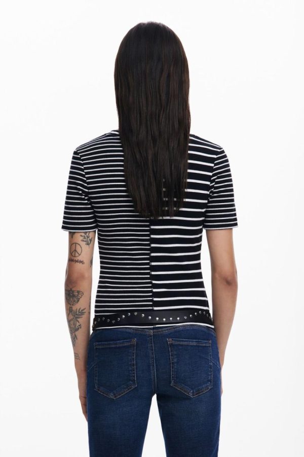 Elevate your casual wardrobe with this eye-catching short-sleeved T-shirt featuring a comfortable round neckline and artistic patchwork design that blends multiple striped patterns for a truly unique look.