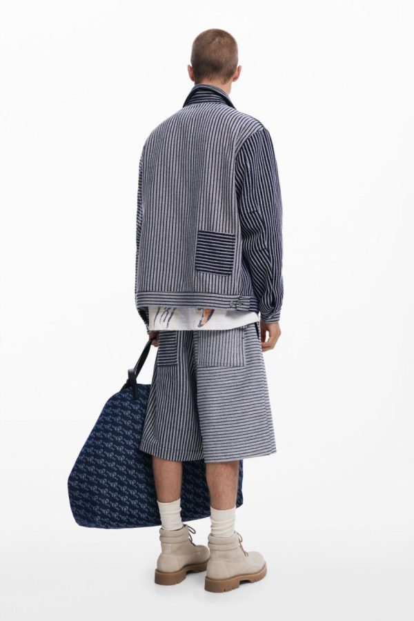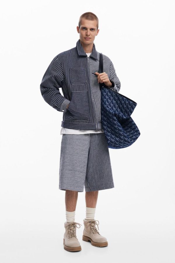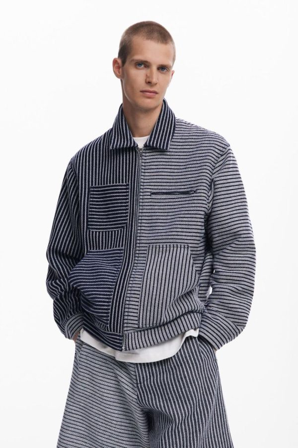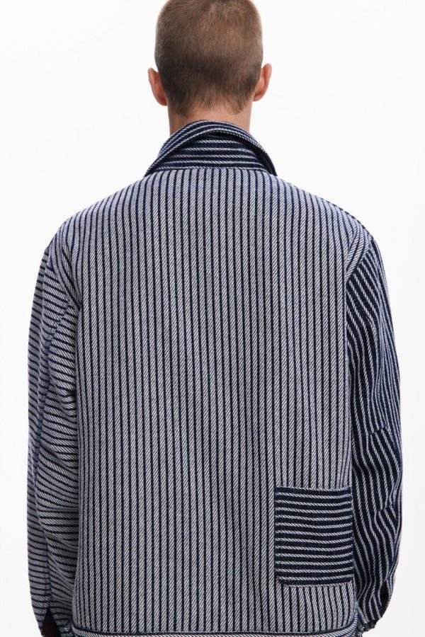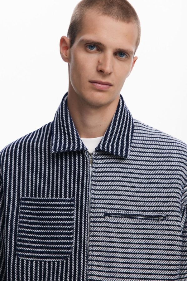 Trucker-style jacket with front pockets, zipper closure, and striped print.