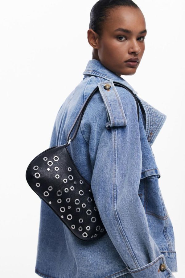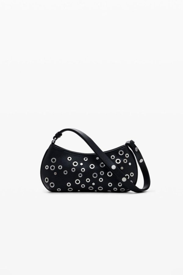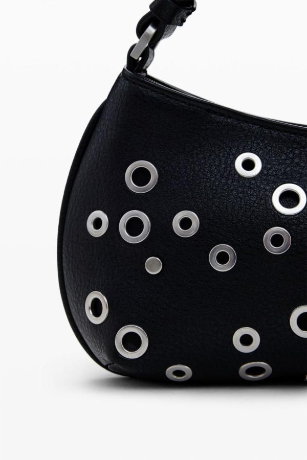 Crossbody style handbag, in faux leather fabric, zipper closure, and metallic stud details.