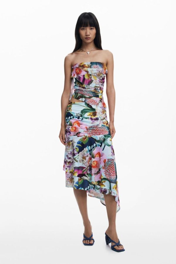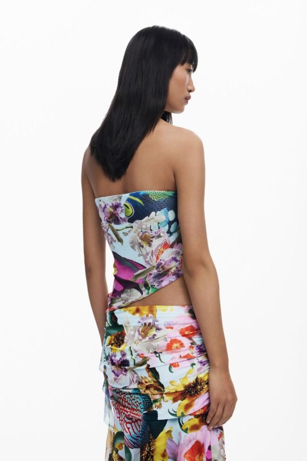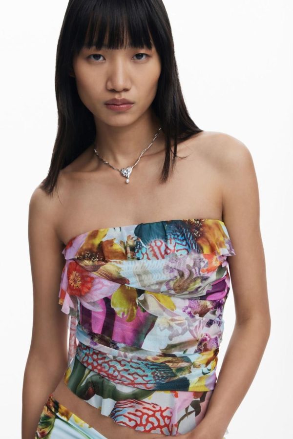 Tulle T-shirt with bandeau neckline, side draping, and asymmetric ruffle details featuring butterfly and feather print designed by Monsieur Christian Lacroix. Includes removable spaghetti straps.
