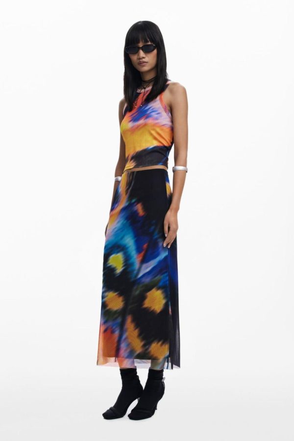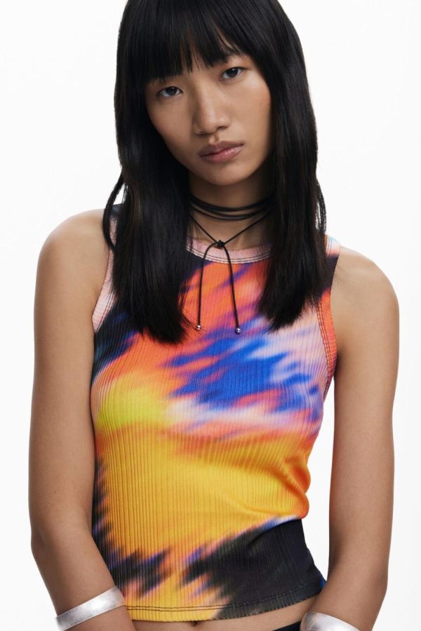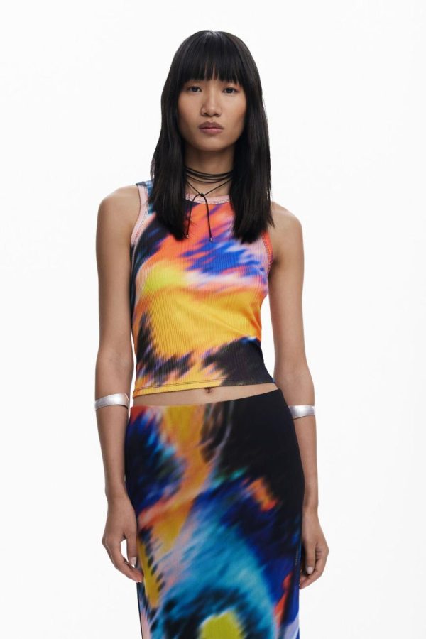 Cropped tulle T-shirt, with a round neck, sleeveless and printed, designed by Monsieur Christian Lacroix.