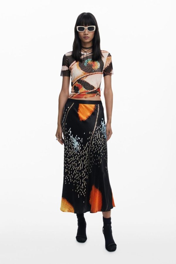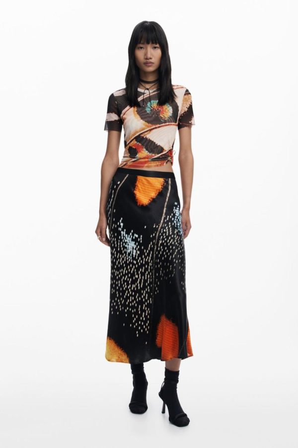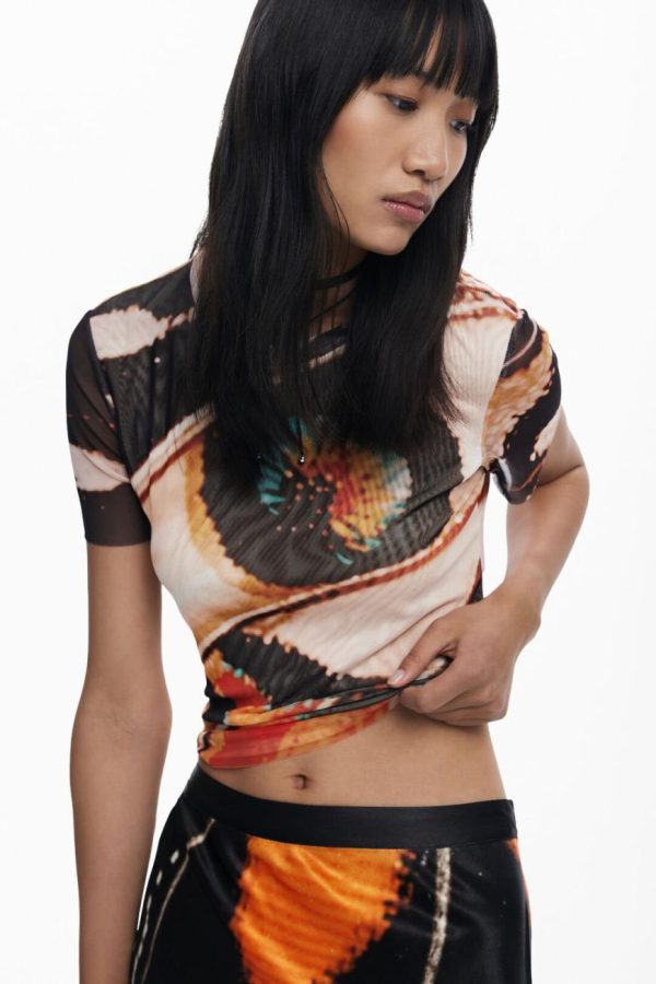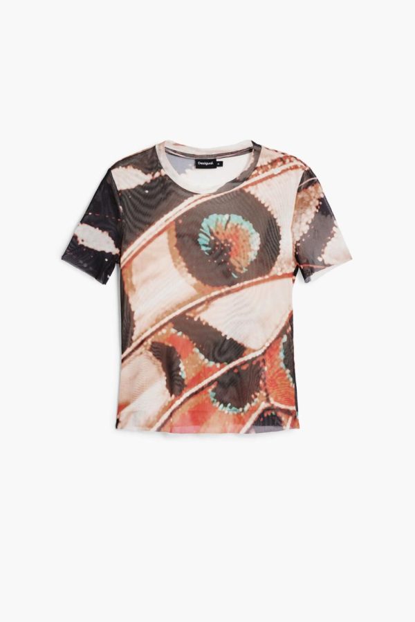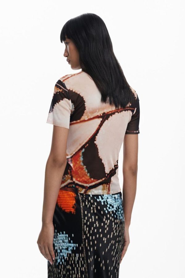 Short-sleeved tulle T-shirt with a round neck and butterfly and feather print designed by Monsieur Christian Lacroix.