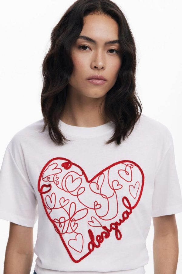 Short-sleeve T-shirt with a round neck in a solid color featuring a 3D embroidered cord detail and printed heart silhouettes.