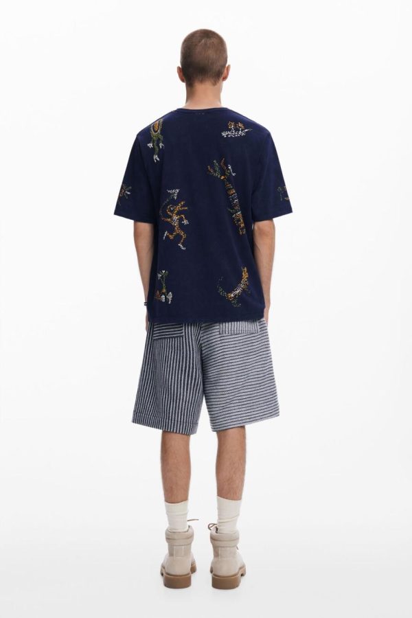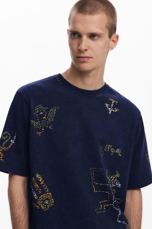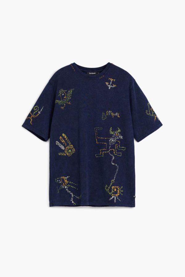 Short-sleeved T-shirt with a round neck and tribal illustration embroidery.
