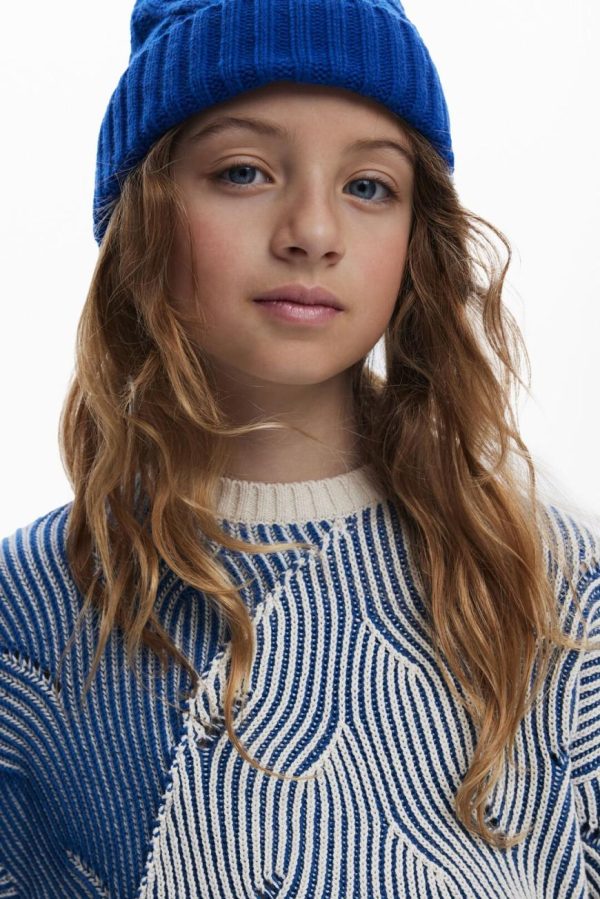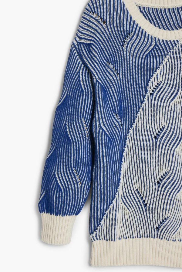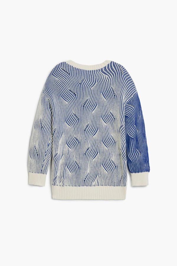 Long-sleeve sweater with a round neck, textured fabric, elastic cuffs and waist, and a combination stripe print.