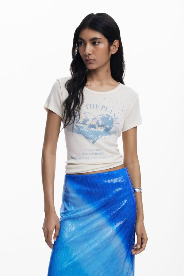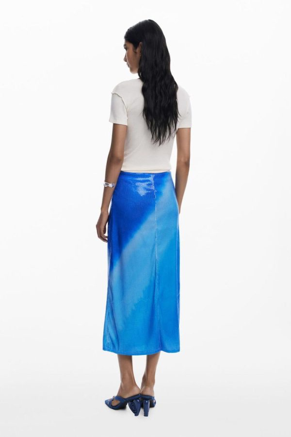 Knee-length skirt with a soft touch, in stretchy fabric, featuring a tie-dye print in blue tones.