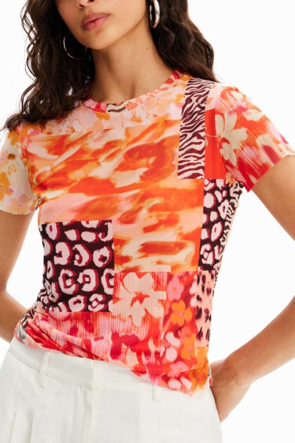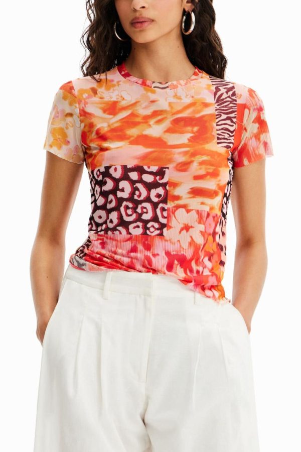 A fitted short-sleeve T-shirt in stretch tulle with a patchwork animal and floral print.