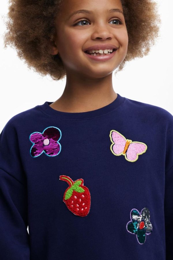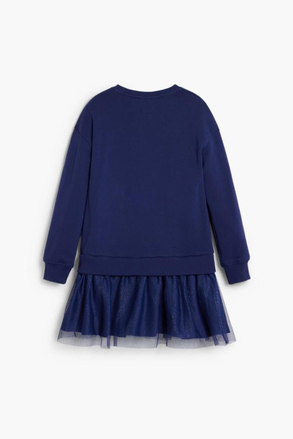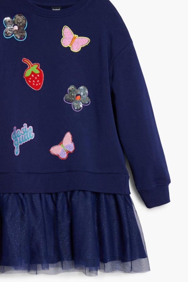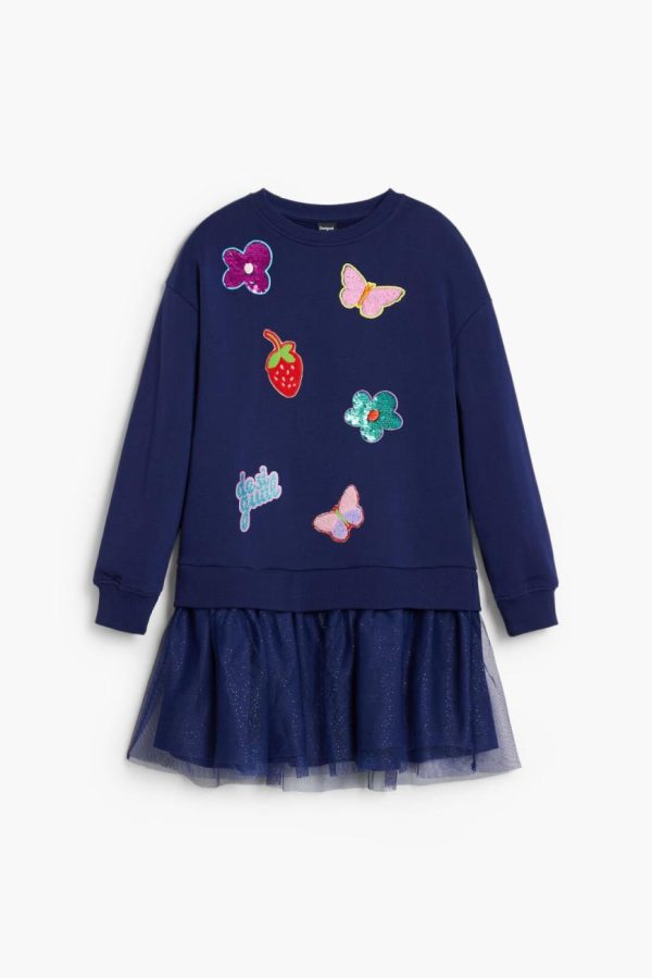 Long-sleeve dress with a round neck, two-piece effect, and tulle skirt, in solid color with detail of shapes and figures in appliqués.