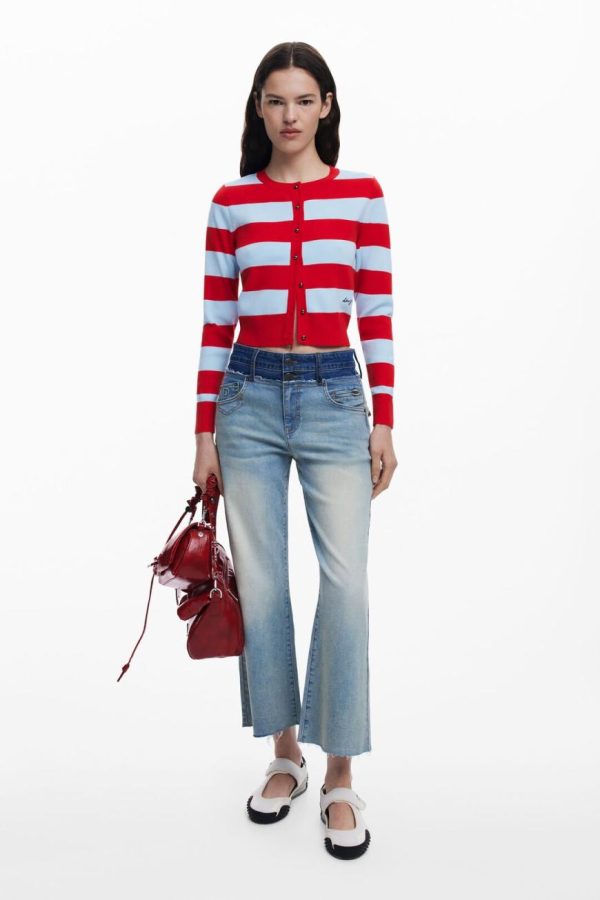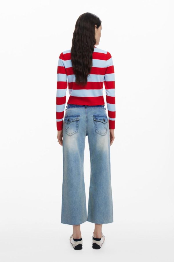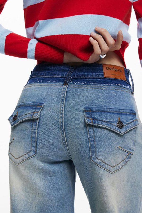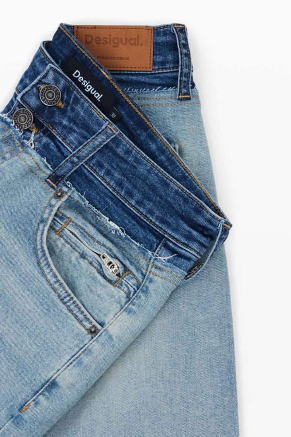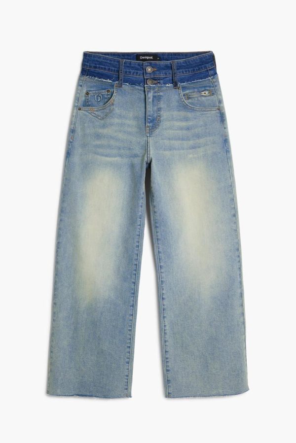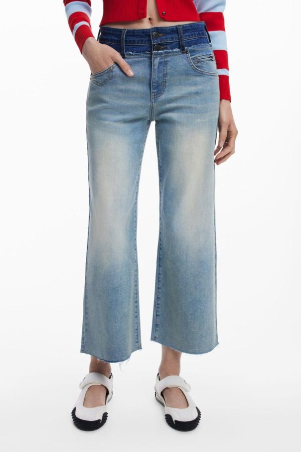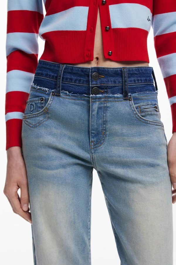 Elevate your casual style with these straight-cut denim pants featuring an eye-catching double waist patchwork design. The two-tone frayed seams create a perfectly distressed, worn-in look that adds authentic character to your everyday wardrobe.