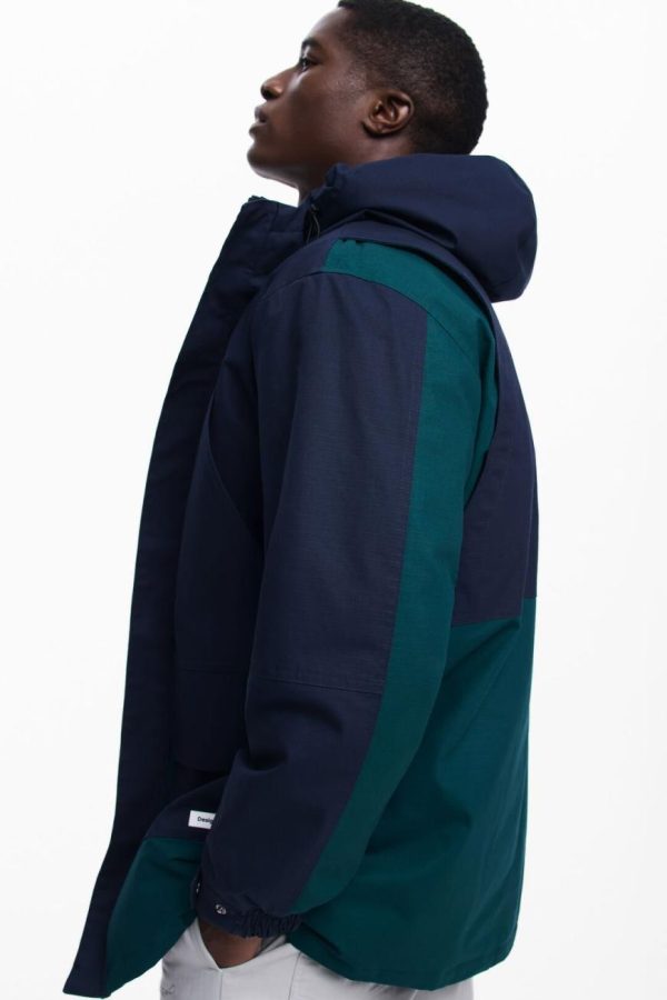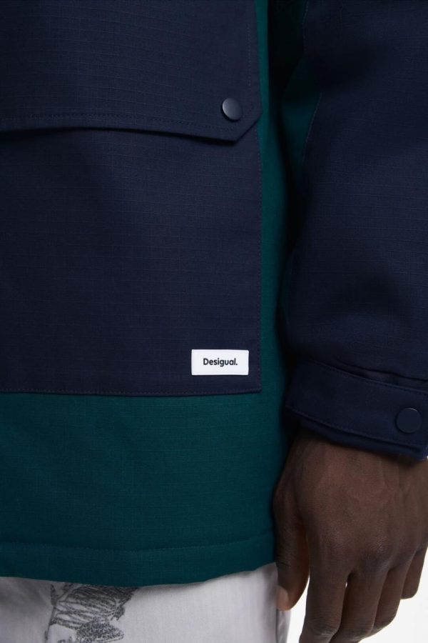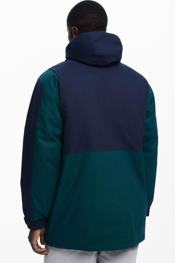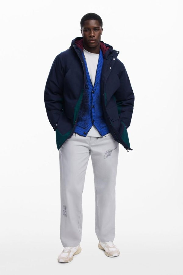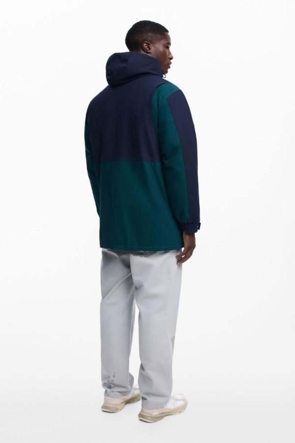 Long padded bicolor parka with multiple front pockets, zipper and button closure, and hood.