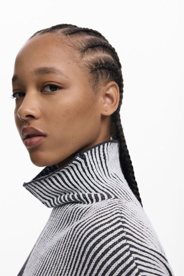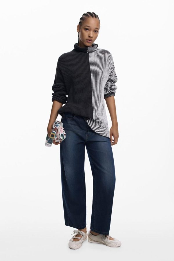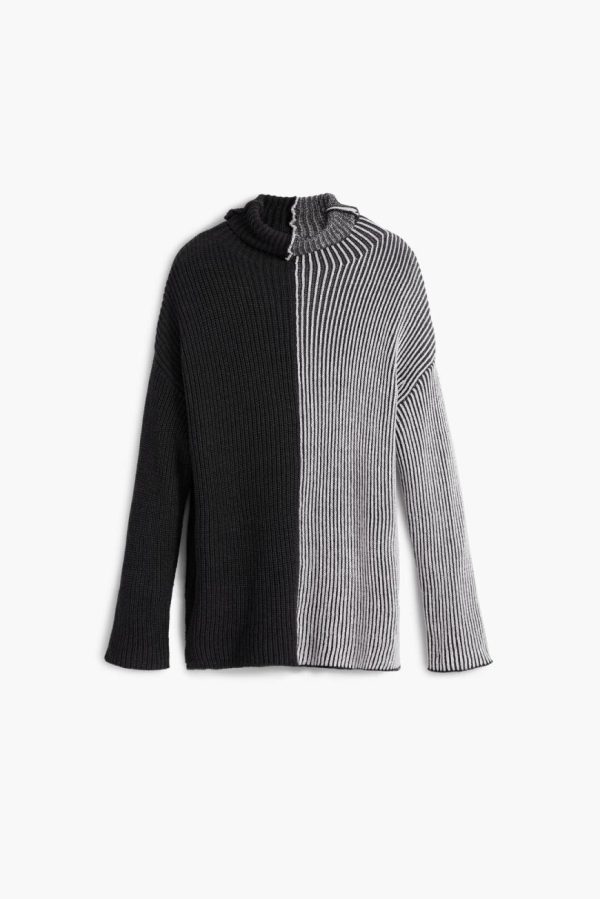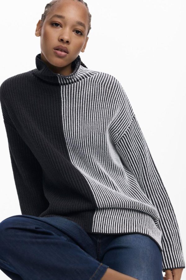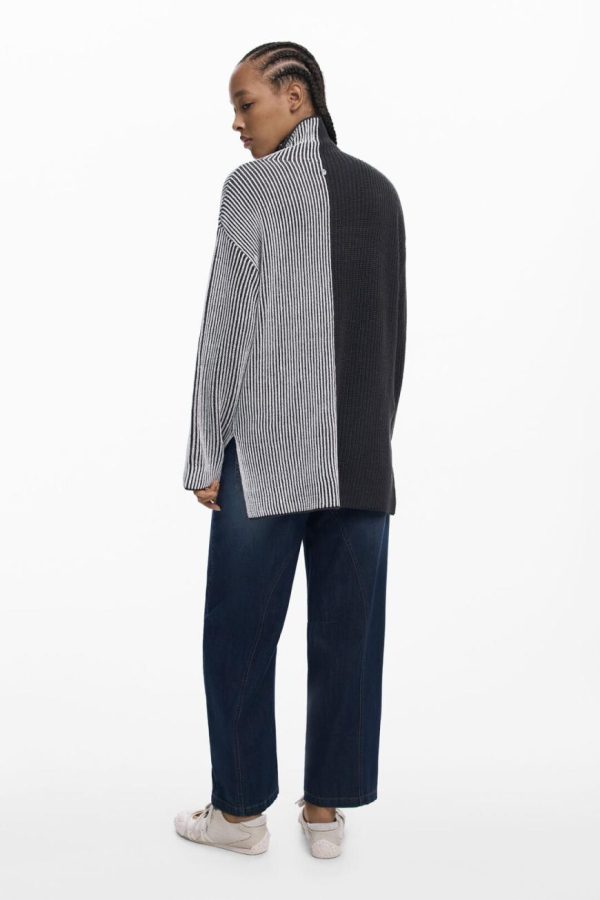 Long-sleeve sweater with a high neck, in a two-tone print, vertically divided, with stripes and fabric combination
