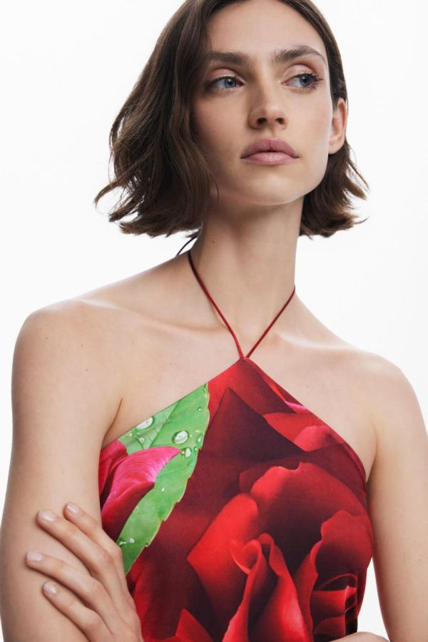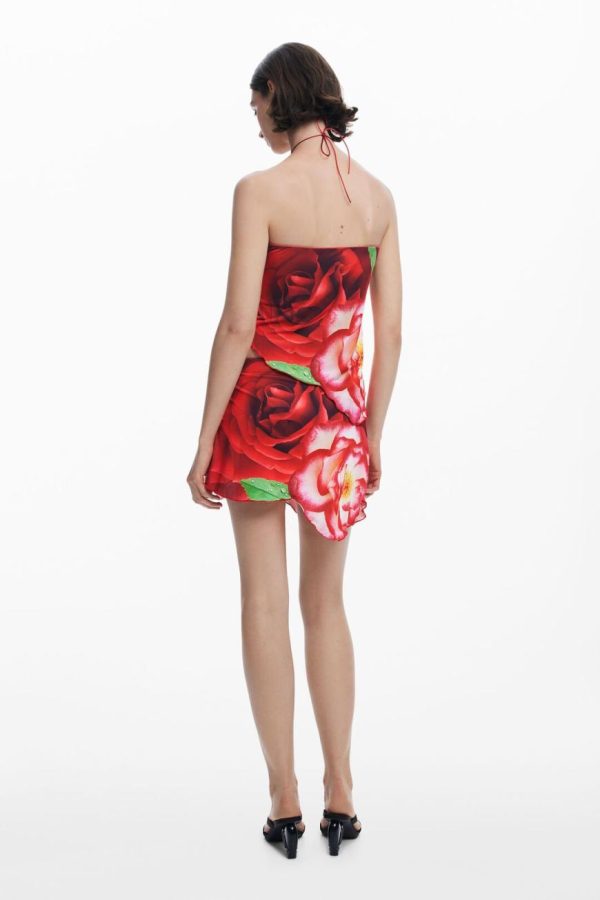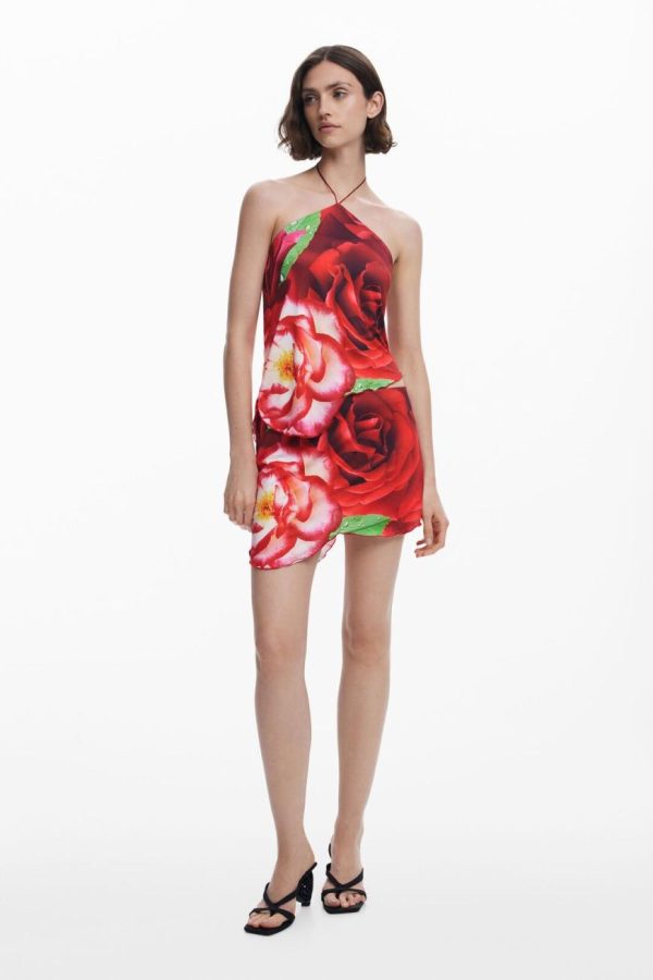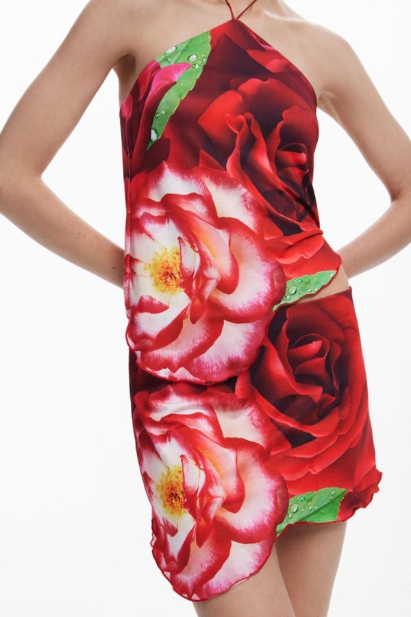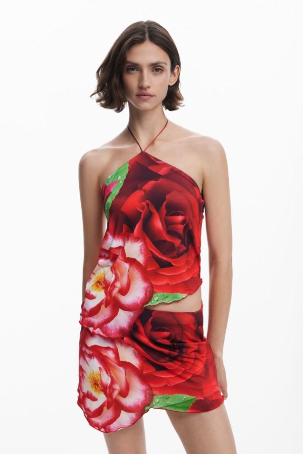 Fitted cropped T-shirt with an asymmetrical hem, tie-neck cord, and floral print designed by Tyler McGillivary.