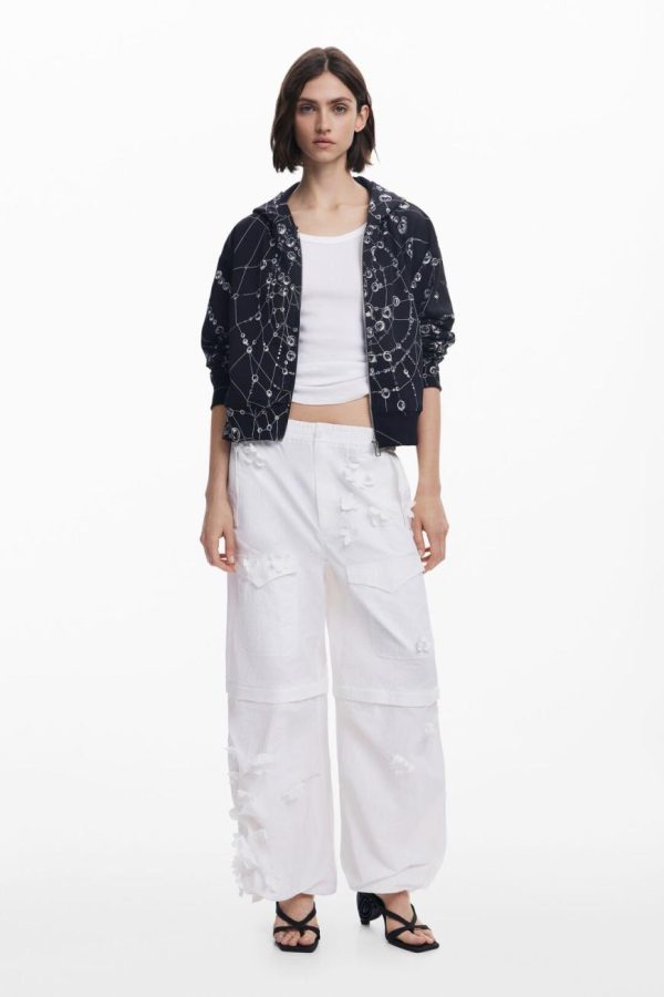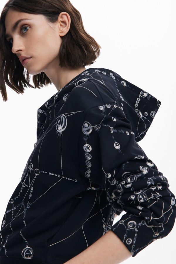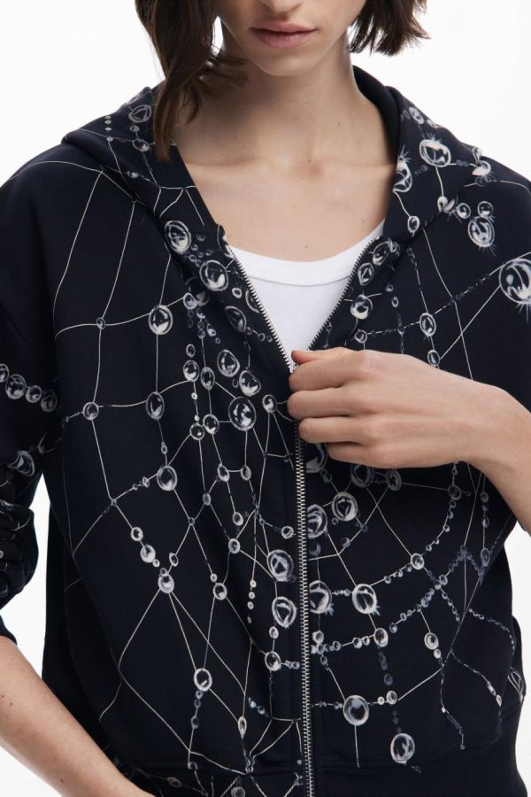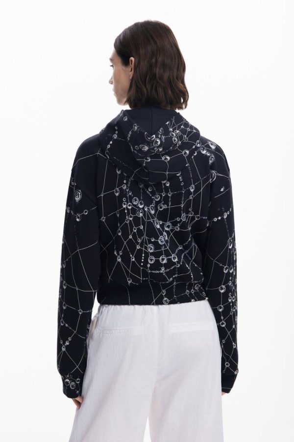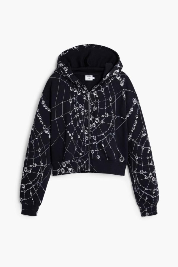 Cropped sweatshirt with elastic, zipper closure, and hood with a lattice print designed by Tyler McGillivary.