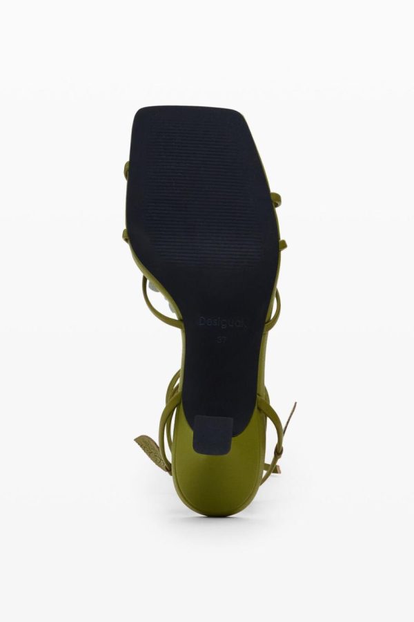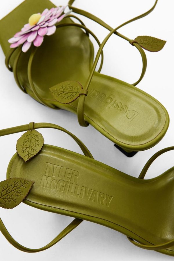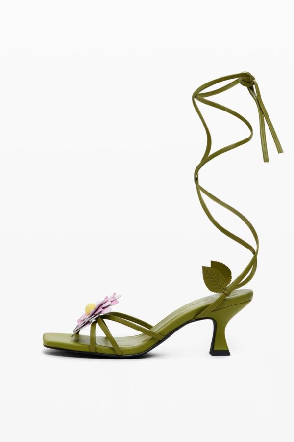 Heeled sandal in faux leather fabric with ankle ties and 3D flower applique, designed by Tyler McGillivary.