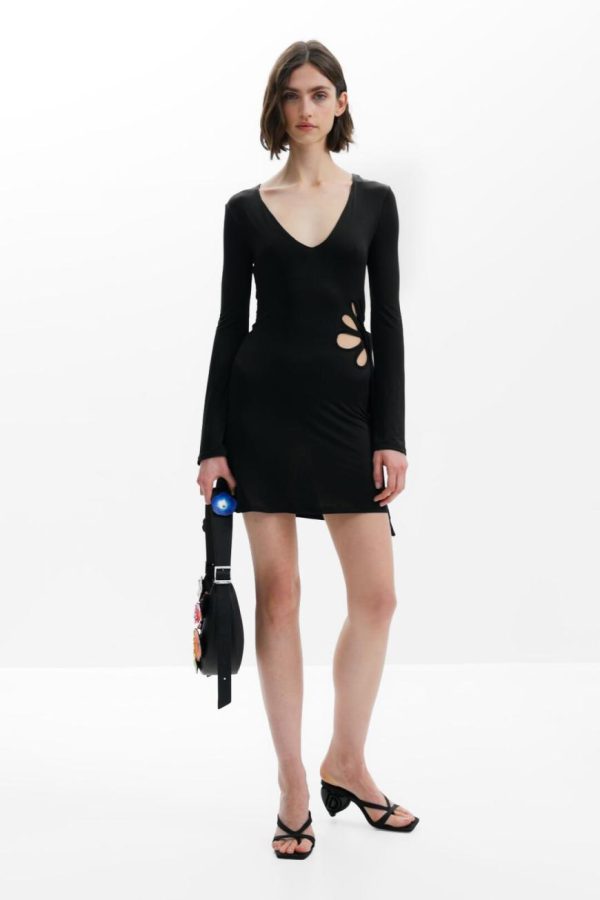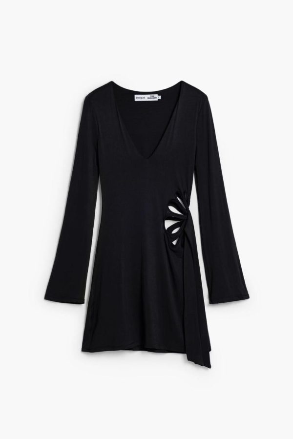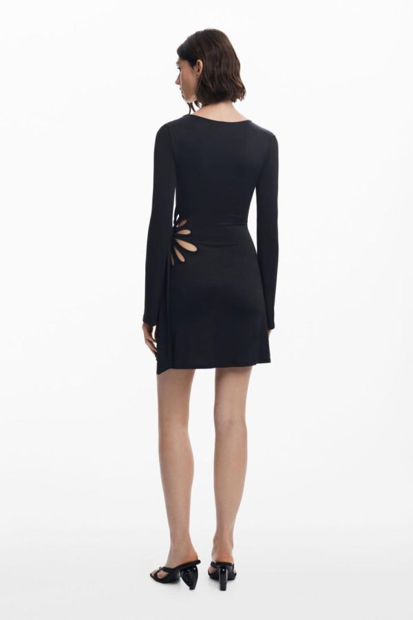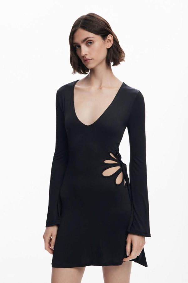 Short dress with A-line skirt, V-neck, long flared sleeves, and die-cut flower on one side designed by Tyler McGillivary.