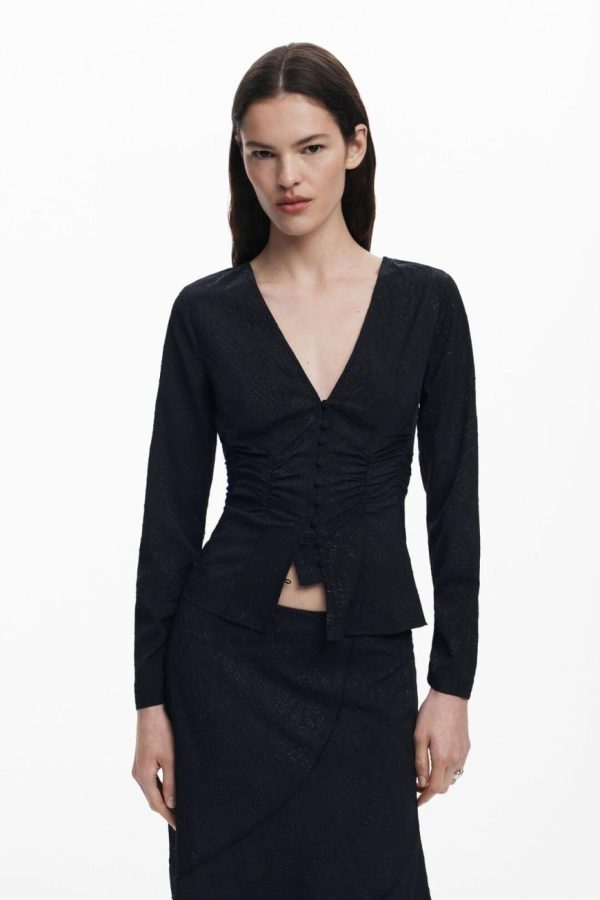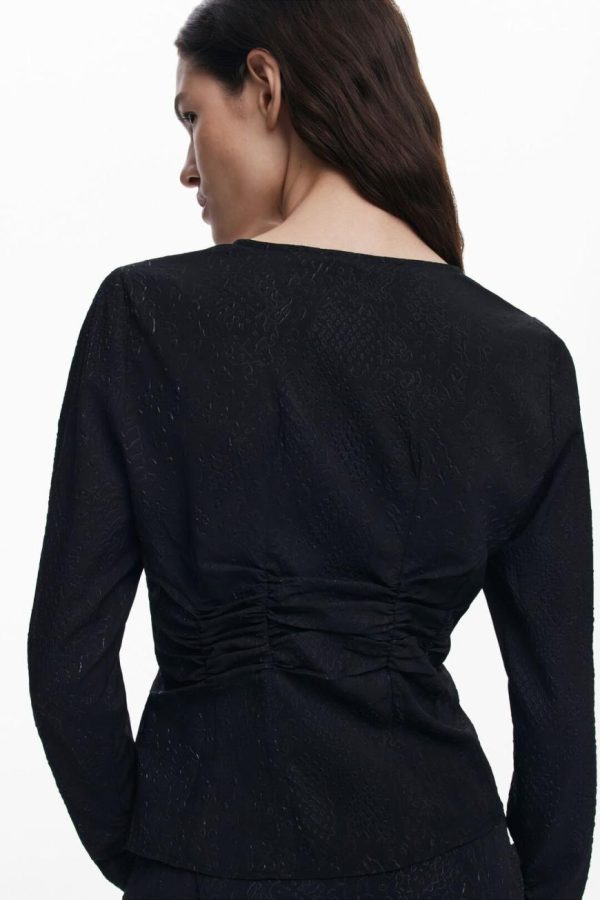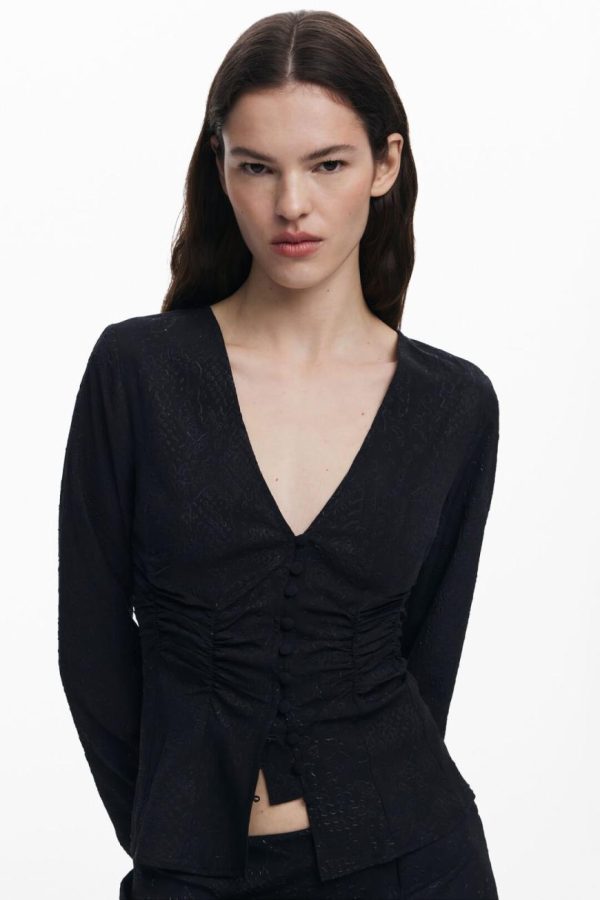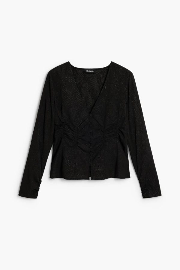 Long-sleeve lace blouse with V-neck, front ruching, and solid color hook-and-eye closure.